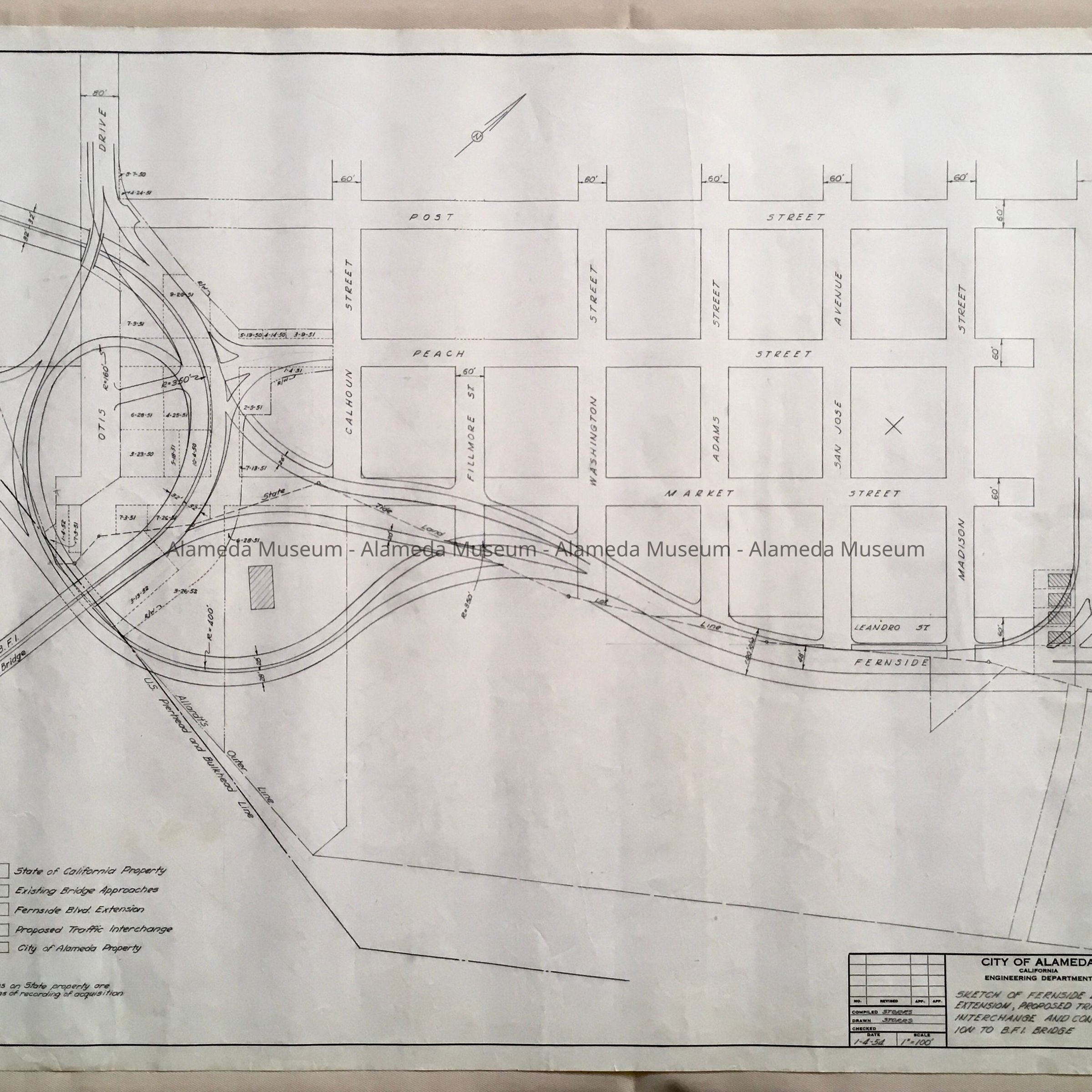 DESCRIPTION: A STREET MAP WHICH APPEARS TO BE HAND-DRAWN IN PENCIL. MAP HAS THE CAPTION, "CITY OF ALAMEDA, CALIFORNIA, ENGINEERING DEPARTMENT." DATED JANUARY 4, 1954.