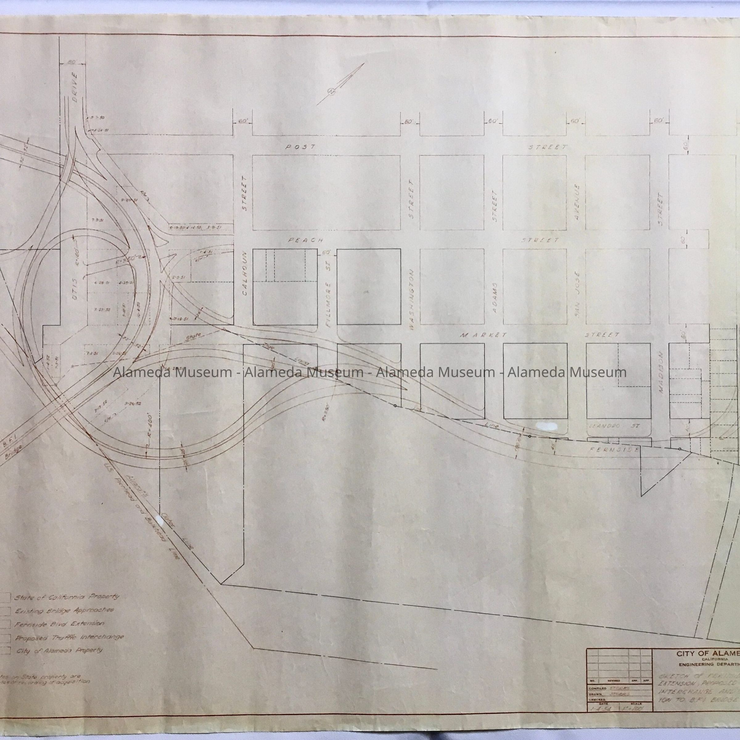 HISTORY OF OBJECT: A SKETCH OF FERNSIDE BOULEVARD EXTENSION, PROPOSED TRAFFIC INTERCHANGE, AND CONNECTION TO THE BAY FARM ISLAND BRIDGE. MAP ALSO DEFINES STATE OF CALIFORNIA AND CITY OF ALAMEDA PROPERTY.