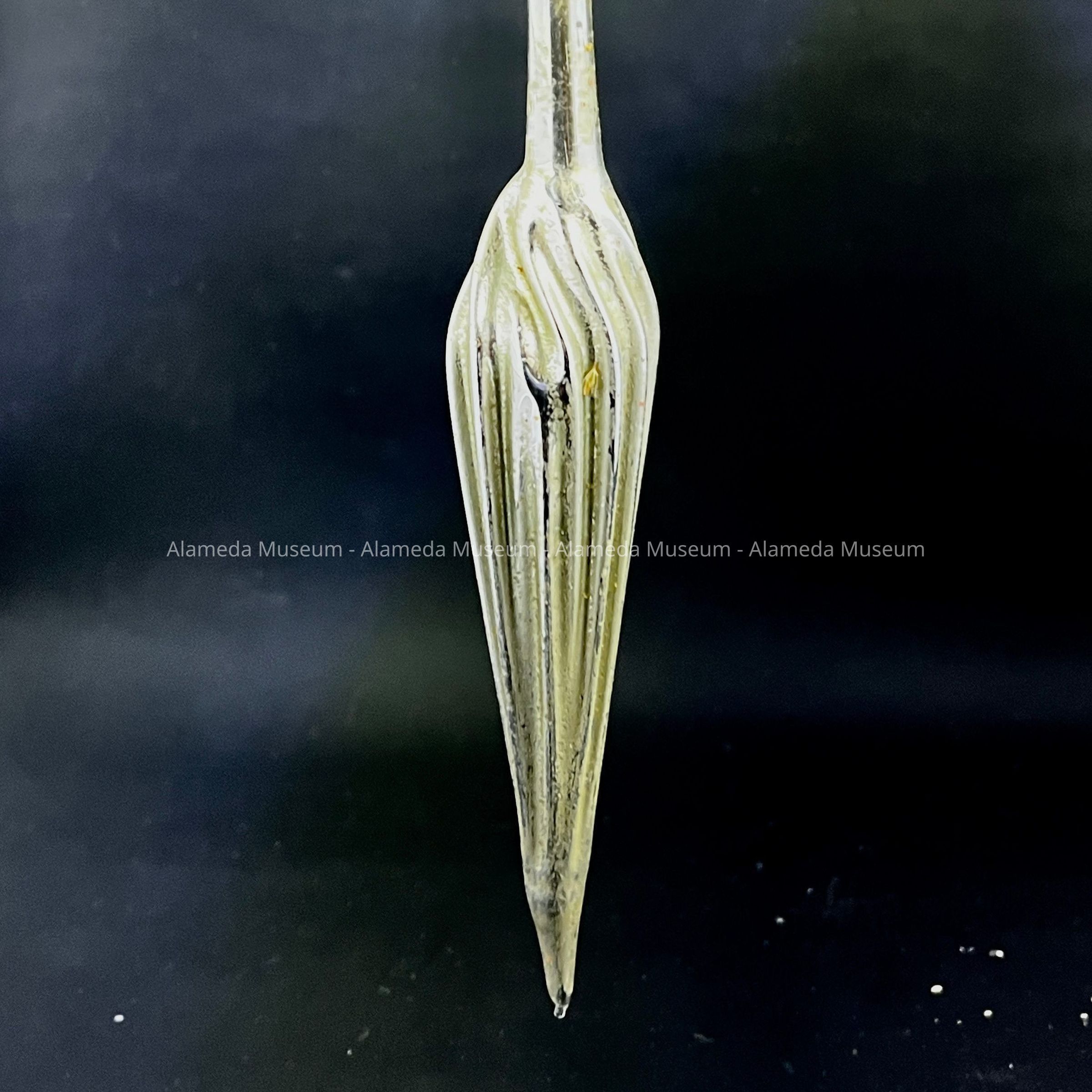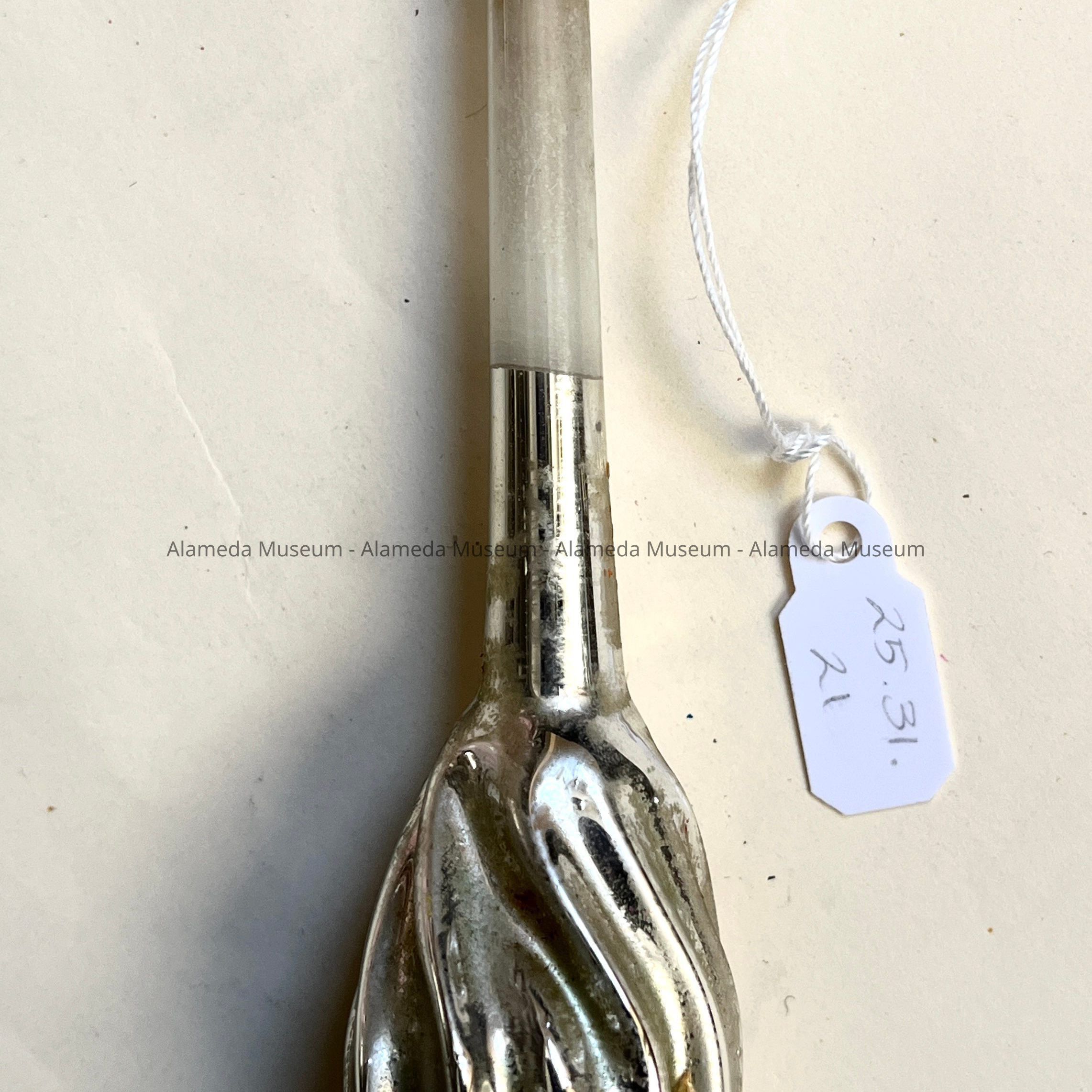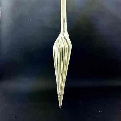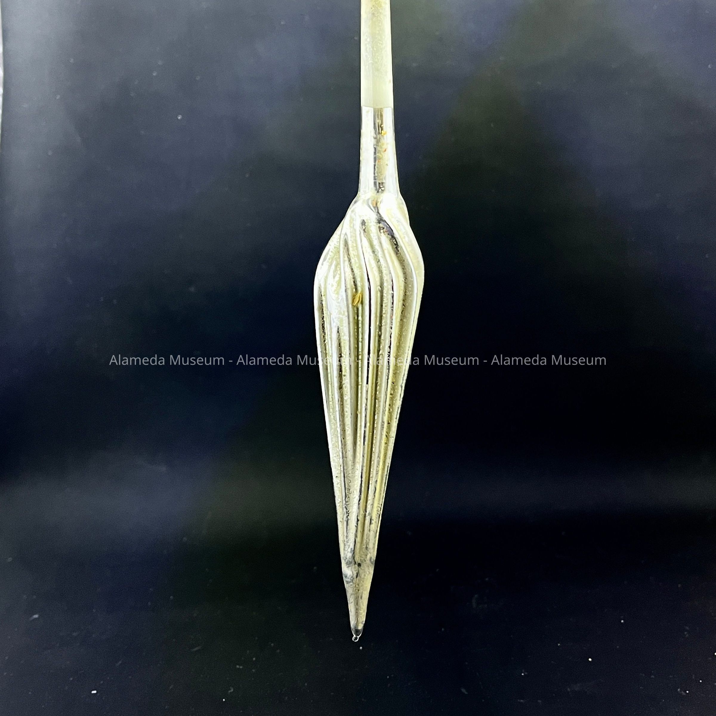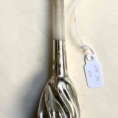 Description: A mercury glass ornament with a long stem, coming to a broadened section with striations narrowing again to a point. Top section of the stem is transparent glass and ends in a thickened section around which a string is attached. Possibly simulating a brush? Or a spindle?