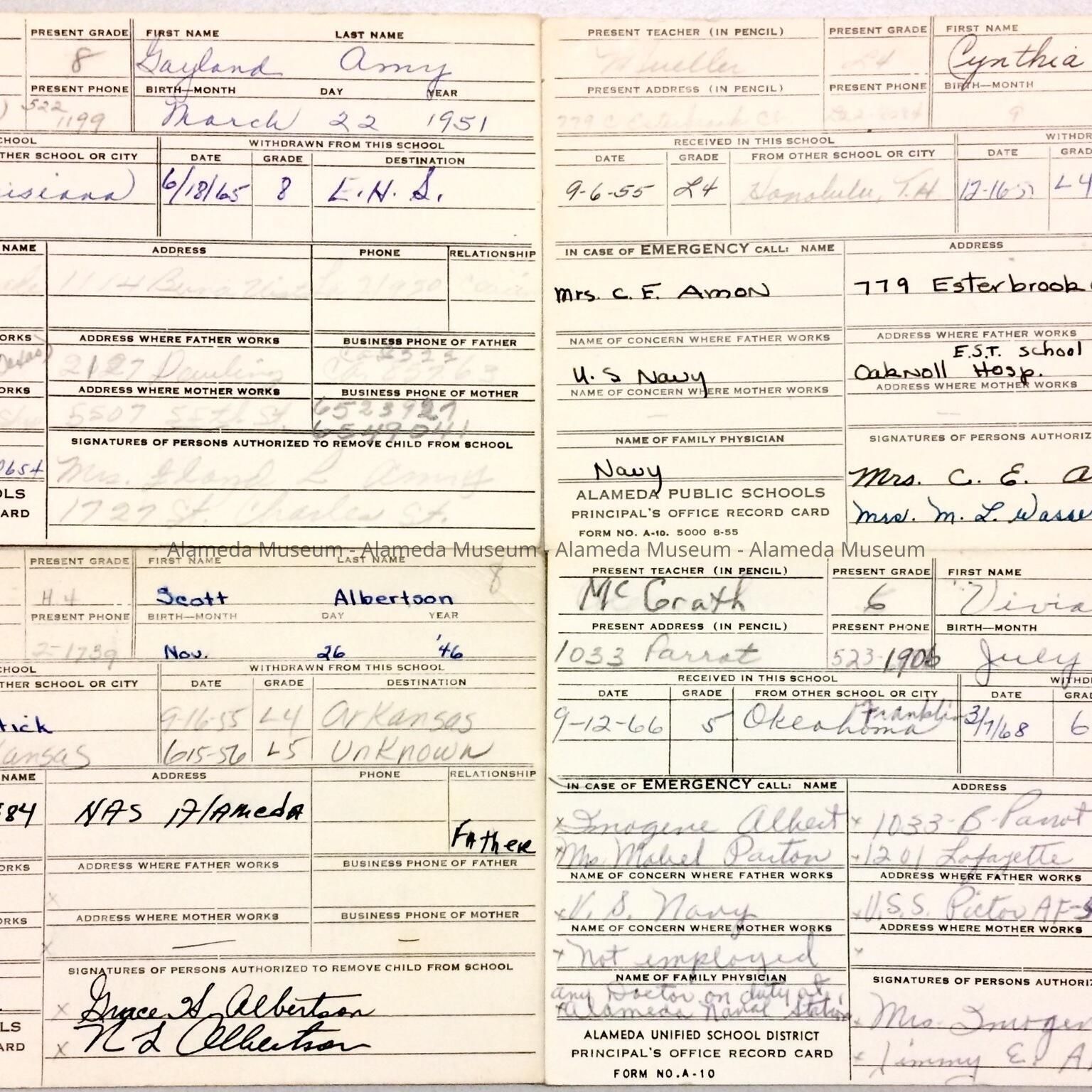 History of Object: Transfer forms kept in the main office of Haight School. Most of the parents listed are affiliated with various branches of the US military.