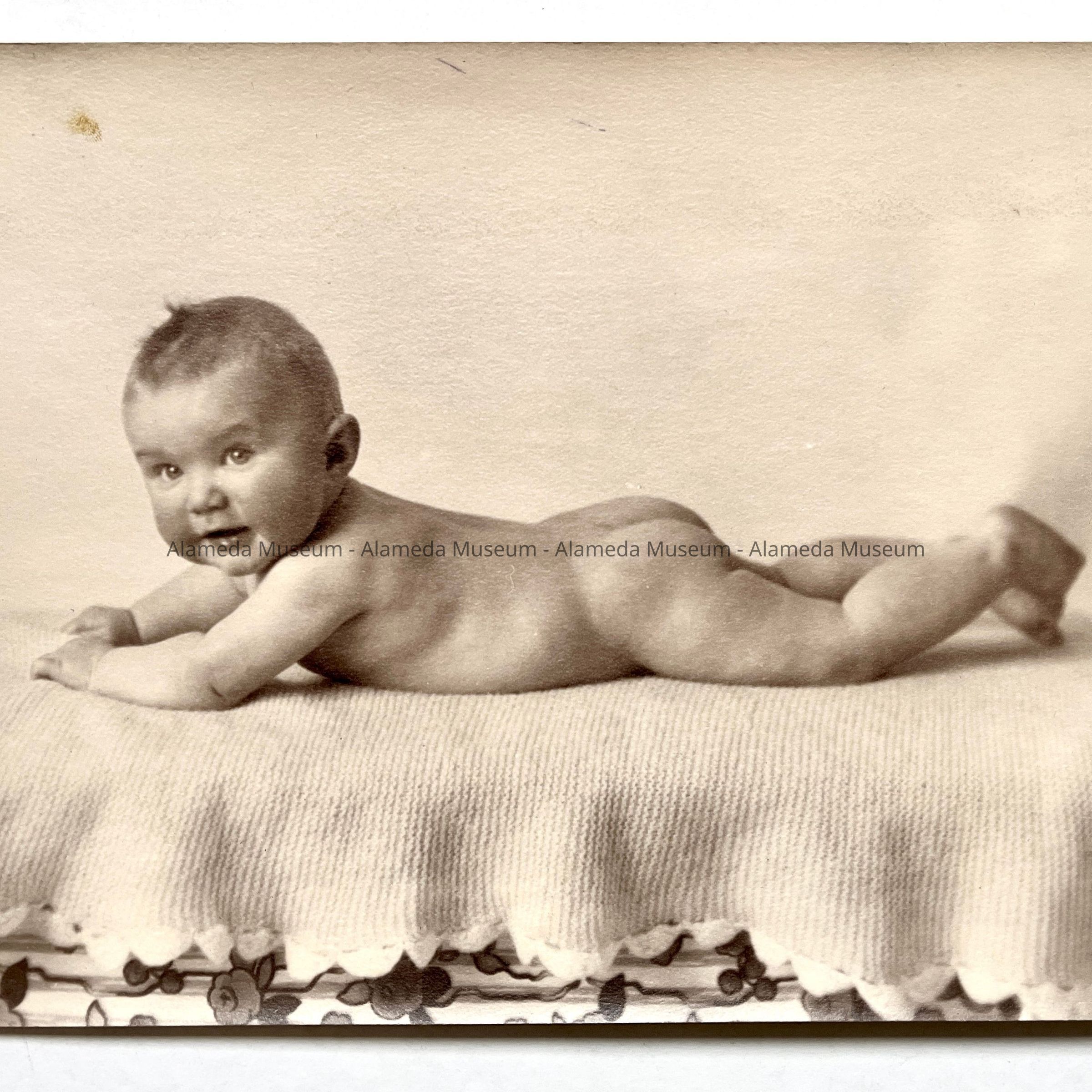 History of Object: Nude photo of infant, Robert Bierwith, aged 7 months, stretched cut on his stomach in a studio portrait.