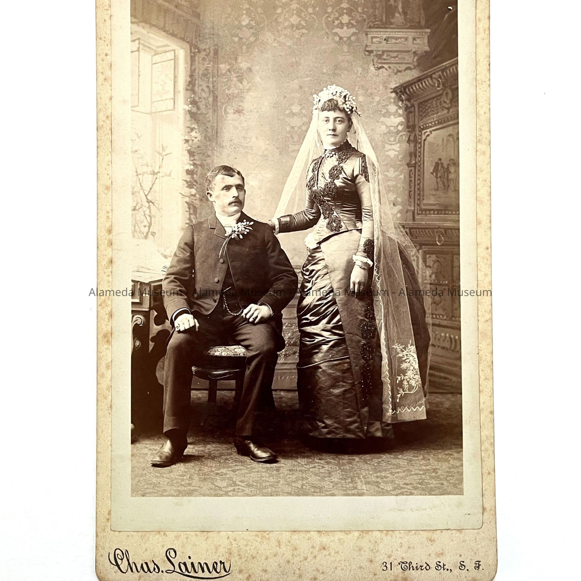History of Object: Studio wedding portrait of an unidentified young couple; the groom is seated on a chair and his veiled bride is standing next to him. Chas. Lainer, the photographer, maintained his residence in Alameda at 1043 San Antonio Avenue (which was in 1902 moved to its present site of 1034 Fair Oaks Avenue). By the time of the 1912 Alameda City Directory, Mr. Lainer had died but his widow, Minnie, survived him.