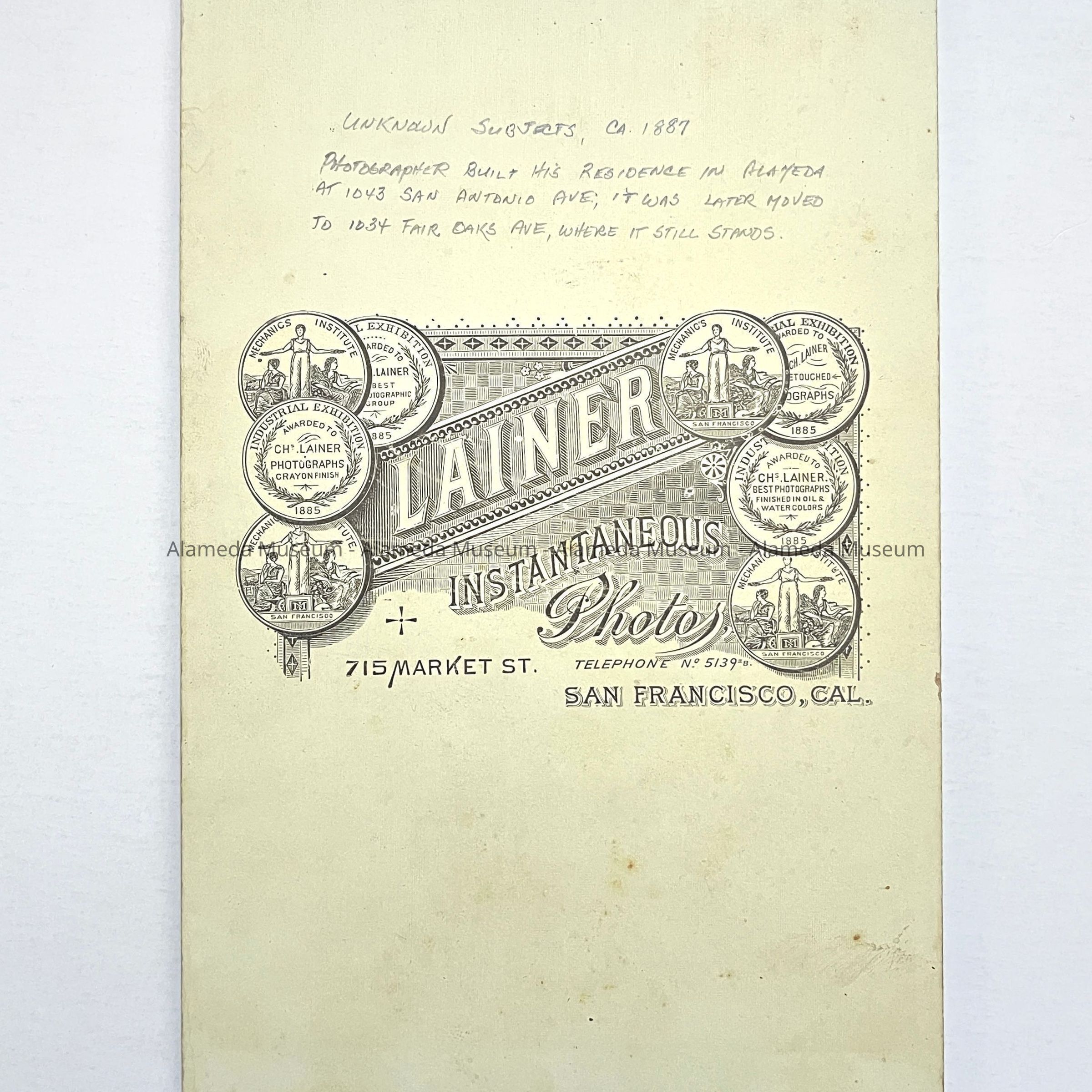 Photographer: Charles Lainer, an Alameda resident, but who maintained his studio on Third Street, San Francisco. The mounting has much foxing.
