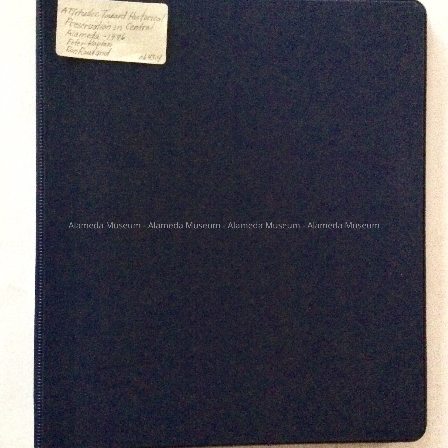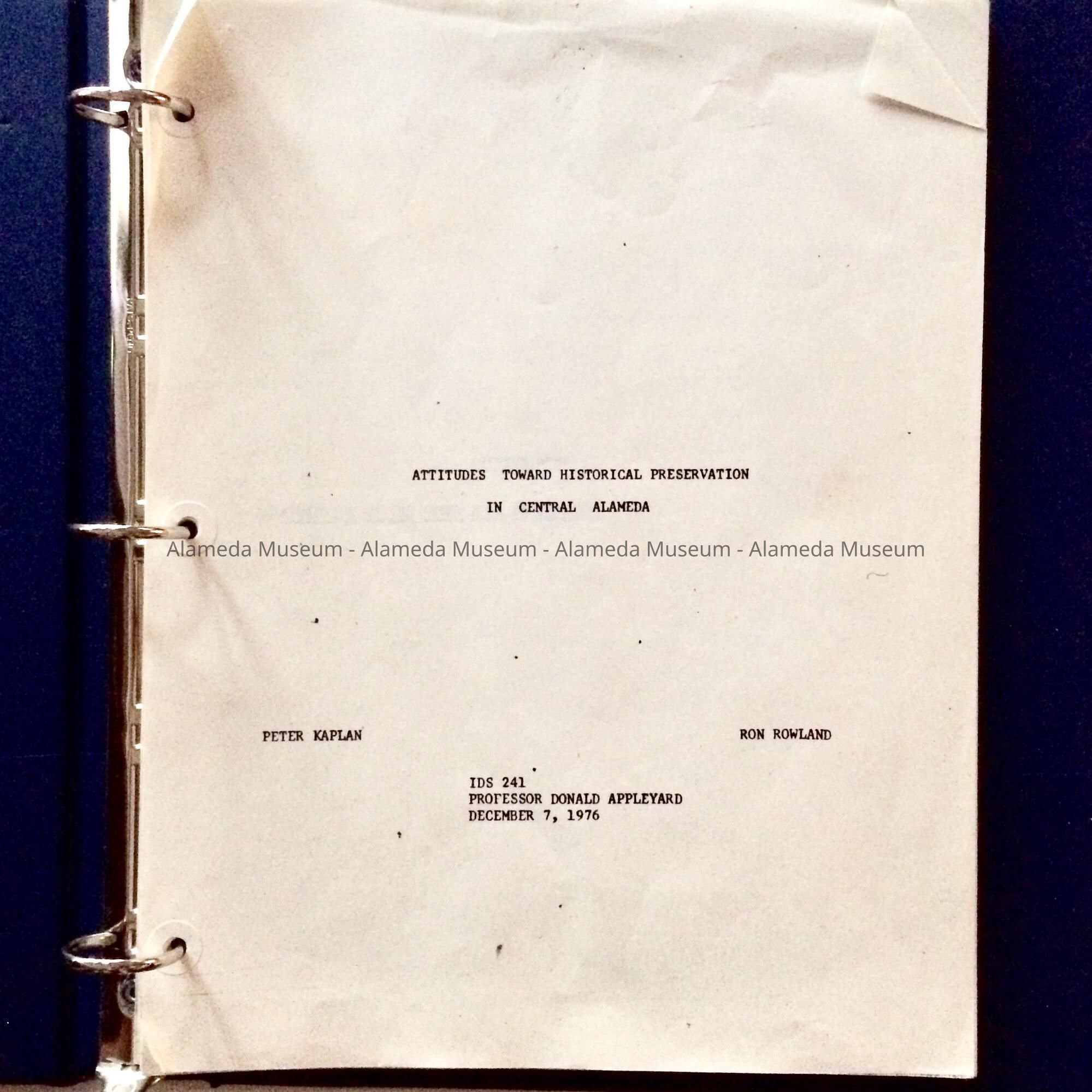 A SOFTCOVER STUDY. OPENING PAGE HAS A BOLD-PRINTED CAPTION, "ATTITUDES TOWARD HISTORICAL PRESERVATION OF CENTRAL ALAMEDA." L 11" X W 8-1/2"