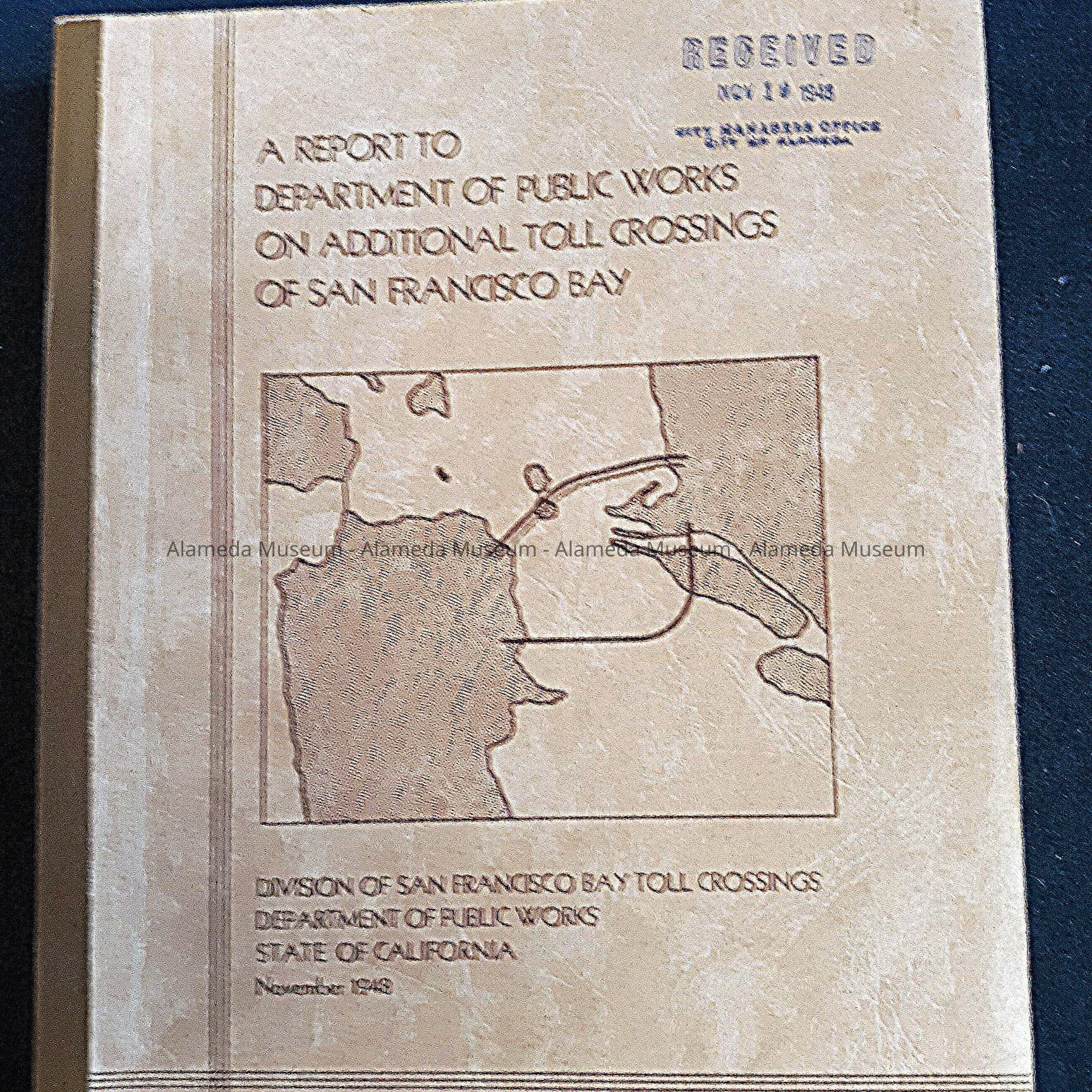 Softbound book, with spine of a buckram strip, and titled 'A Report to Department of Public Works on Additional Toll Crossings of San Francisco Bay', dated November 1948, by Division of San Francisco Bay Toll Crossings, Department of Public Works, State of California'. Stamped on the front cover, 'Received, Nov. 19, 1948, City Managers Office, City of Alameda'. Printed book with typeset professional layout. Includes traffic studies, cost estimates, history of the ferry system, field investigations, financing, etc. Contains photos and maps.