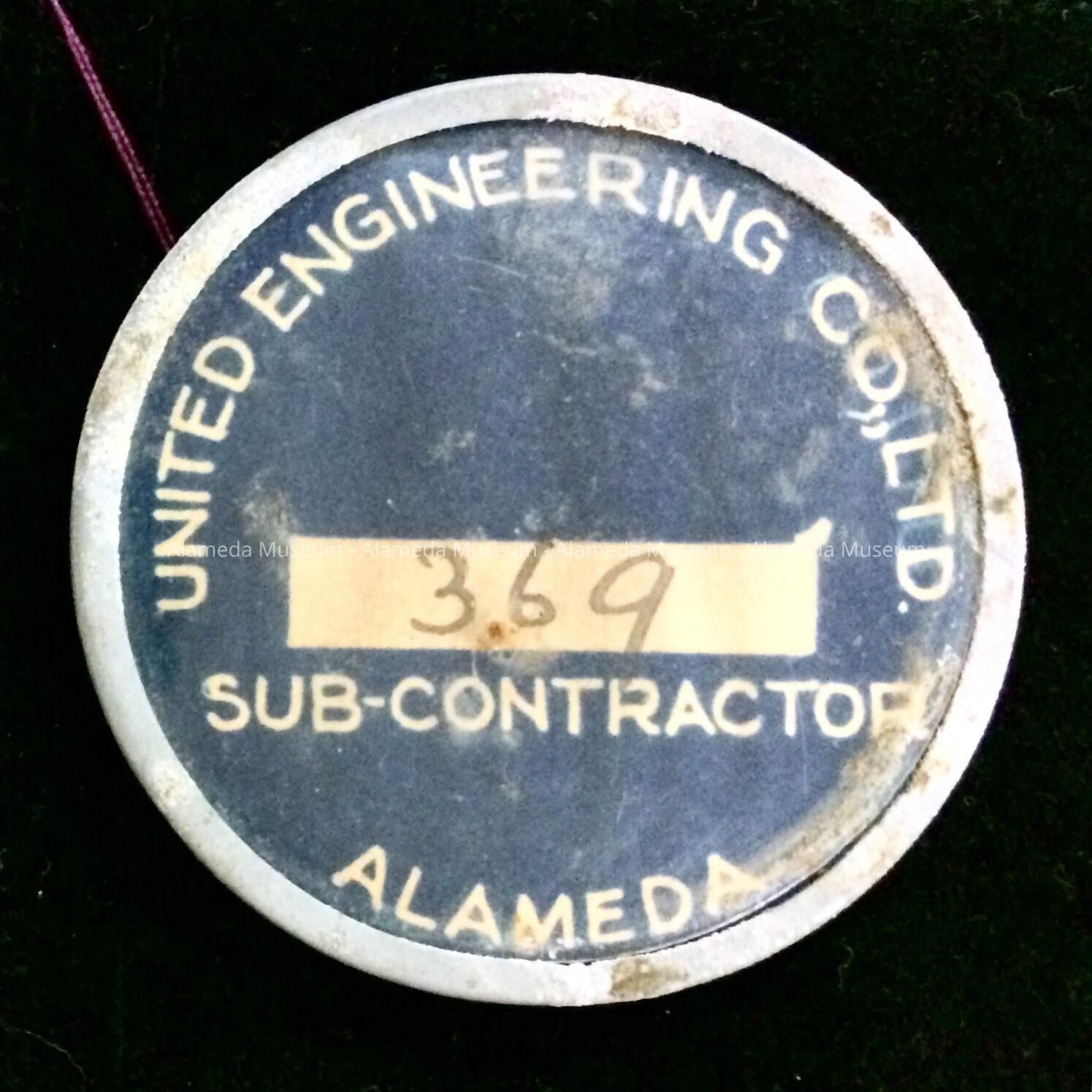 IDENTIFICATION BADGE FOR A SUBCONTRACTOR - UNITED ENGINEERING CO., LTD, ALAMEDA. IT WOULD LATER BE ABSORBED BY BETHLEHEM SHIPYARDS.