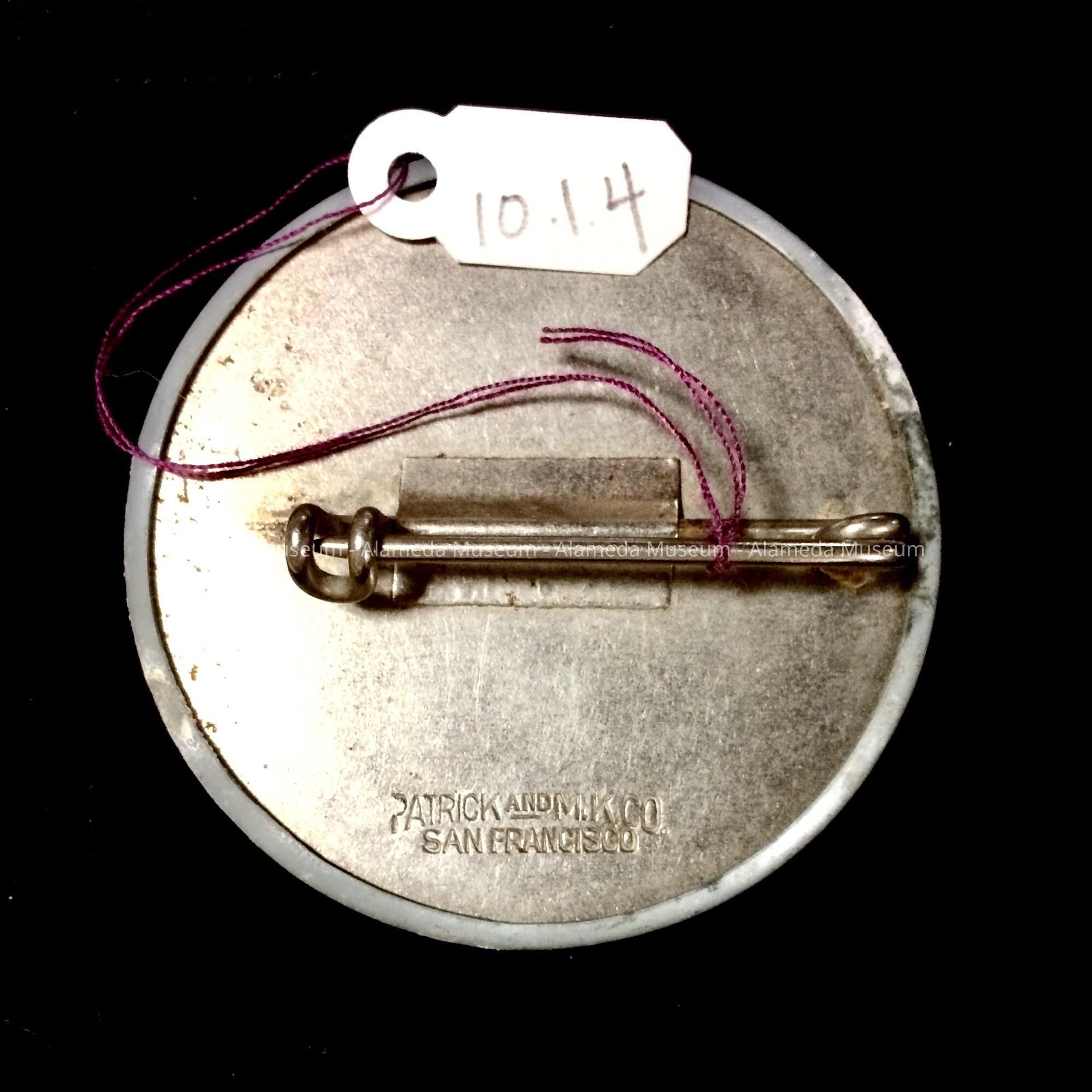 A CIRCULAR-SHAPED BADGE, WITH CELLULOID COVER. COVER IS HELD IN PLACE BY NICKEL-PLATED METAL. CAPTION APPEARS IN WHITE TYPE ON A BLUE-COLORED BACKGROUND. IDENTIFICATION NUMBER IS PRINTED IN INK BY HAND. SIGNED ON REVERSE SIDE, "PATRICK & M K CO., SAN FRANCISCO."