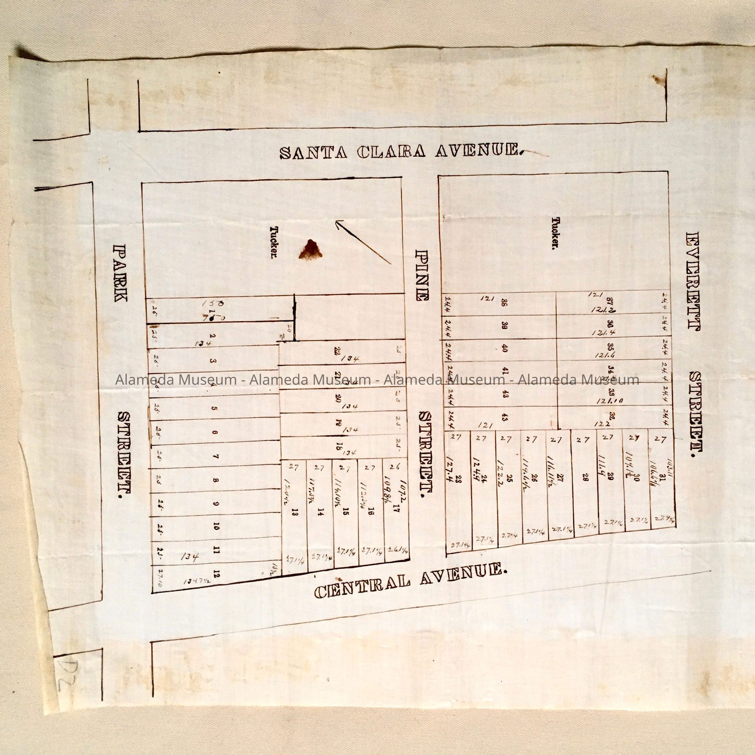 Subdivision map showing individual lots for sale in property bounded by Santa Clara and Central Avenues, Park and Everett Streets. Two blocks are divided by Pine Street, now known as Park Avenue. This collection of maps, etc., found in the attic of City Hall prior to the rehabilitation and seismic upgrades in the late 1990's.