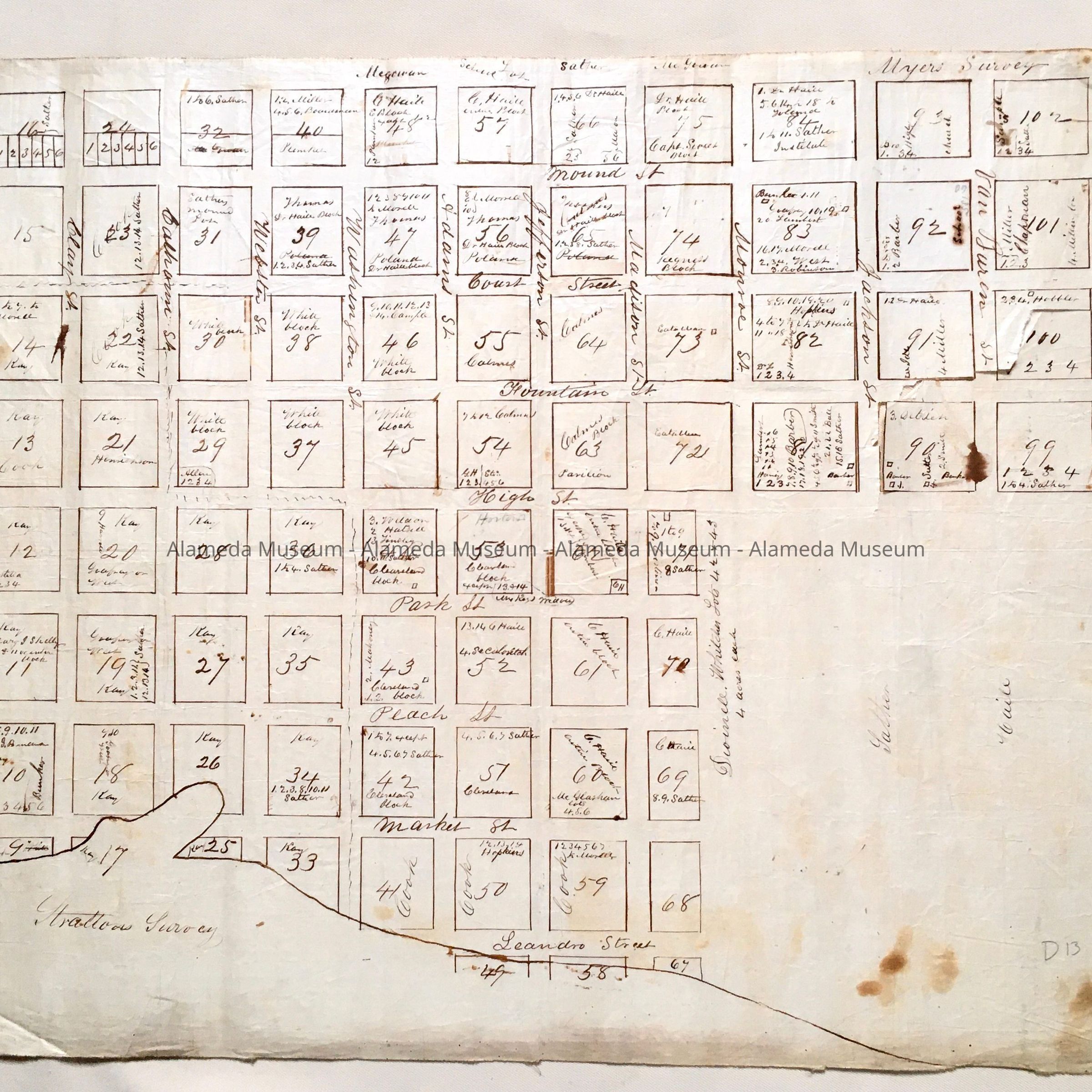 Subdivision map showing ownership of blocks of land in the East End in the Old Town of Alameda. During this period, San Jose is known as Jefferson Street. Early map shows blocks in the vicinity of High Street, mostly named after Presidents of the U.S.