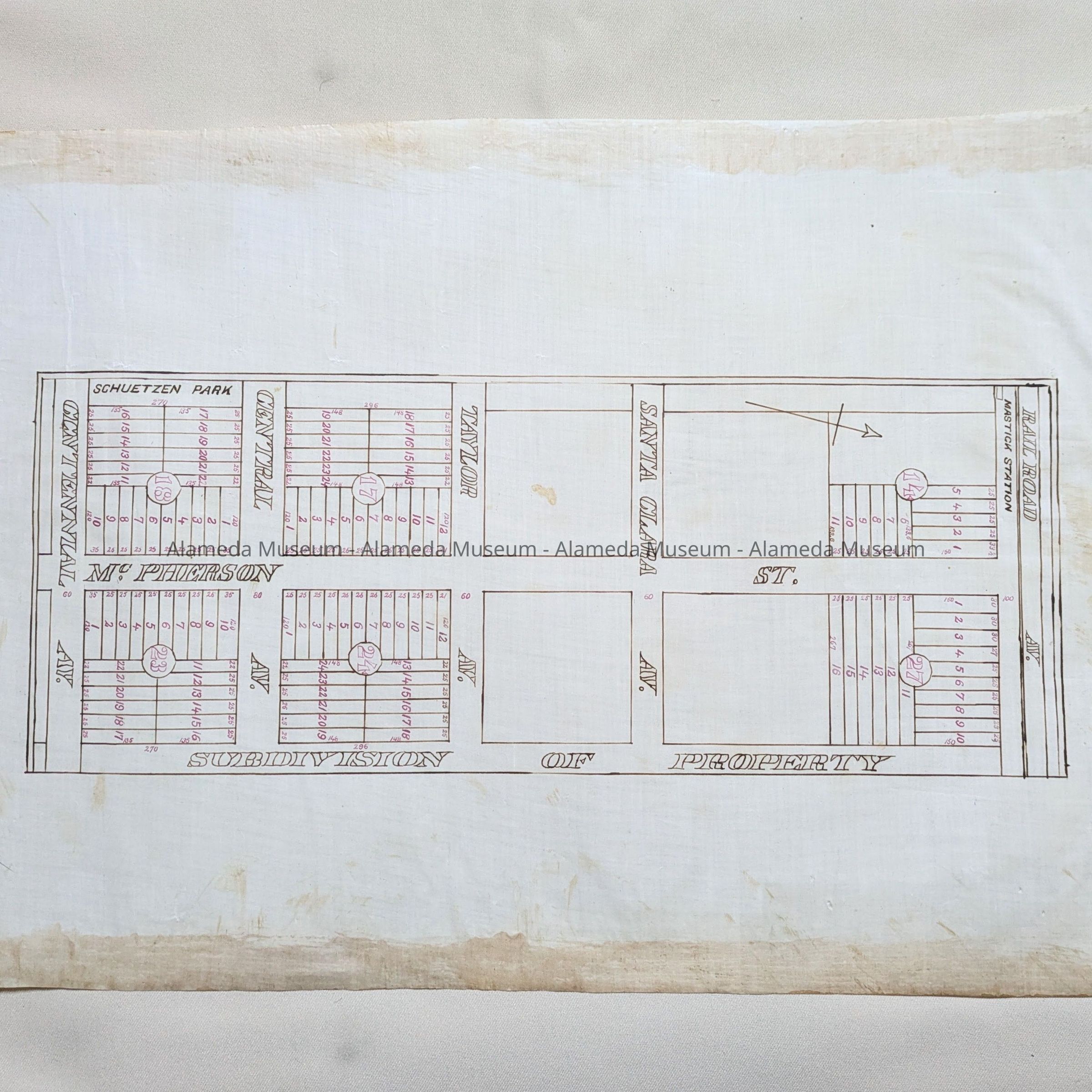 History of Object: Block map of McPherson St. (now Ninth), from Centennial Ave, through Central, Taylor, Santa Clara and Railroad Ave (now Lincoln). Shows the location of Schuetzen Park and Mastick Station.