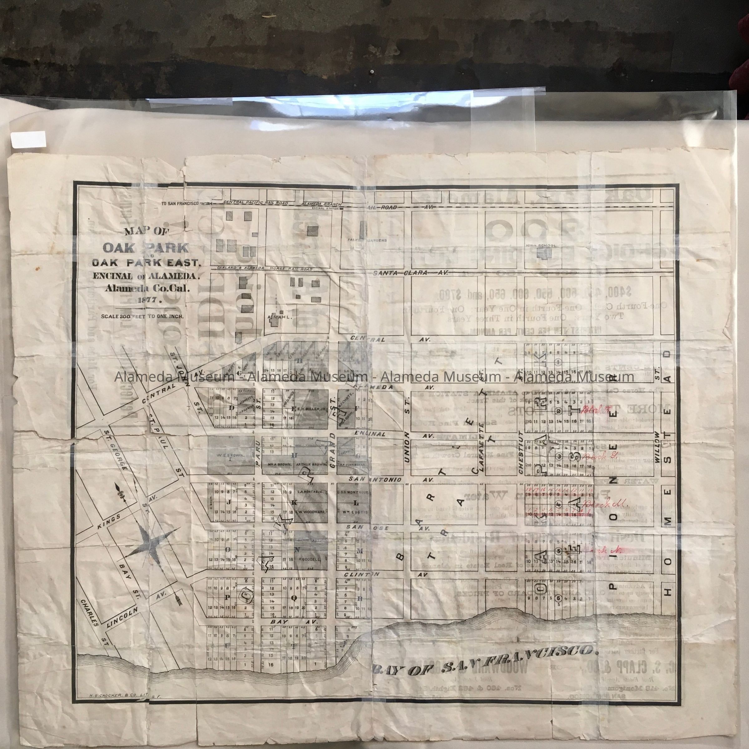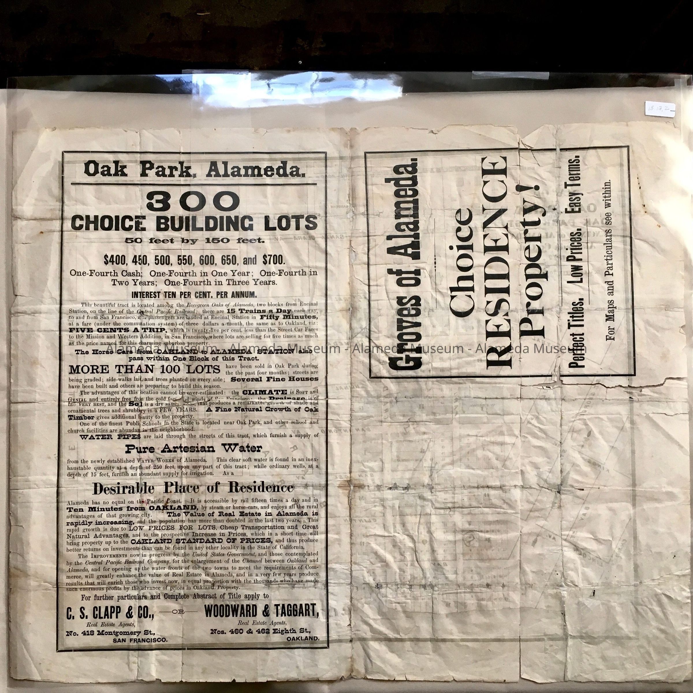 HISTORY OF OBJECT: A SUBDIVISION AND SALESMAN'S MAP FOR PROPERTY IN ALAMEDA KNOWN AS THE OAK PARK TRACT, WHICH INCLUDES LOTS ON GRAND STREET BETWEEN CLINTON AND CENTRAL AVENUES, AND BOUNDED BY UNION AND MORTON STREETS. PART OF THE MUSEUM COLLECTION PRIOR TO 1971. INFORMATION HAS NOT BEEN CATALOGED UNTIL 2015.