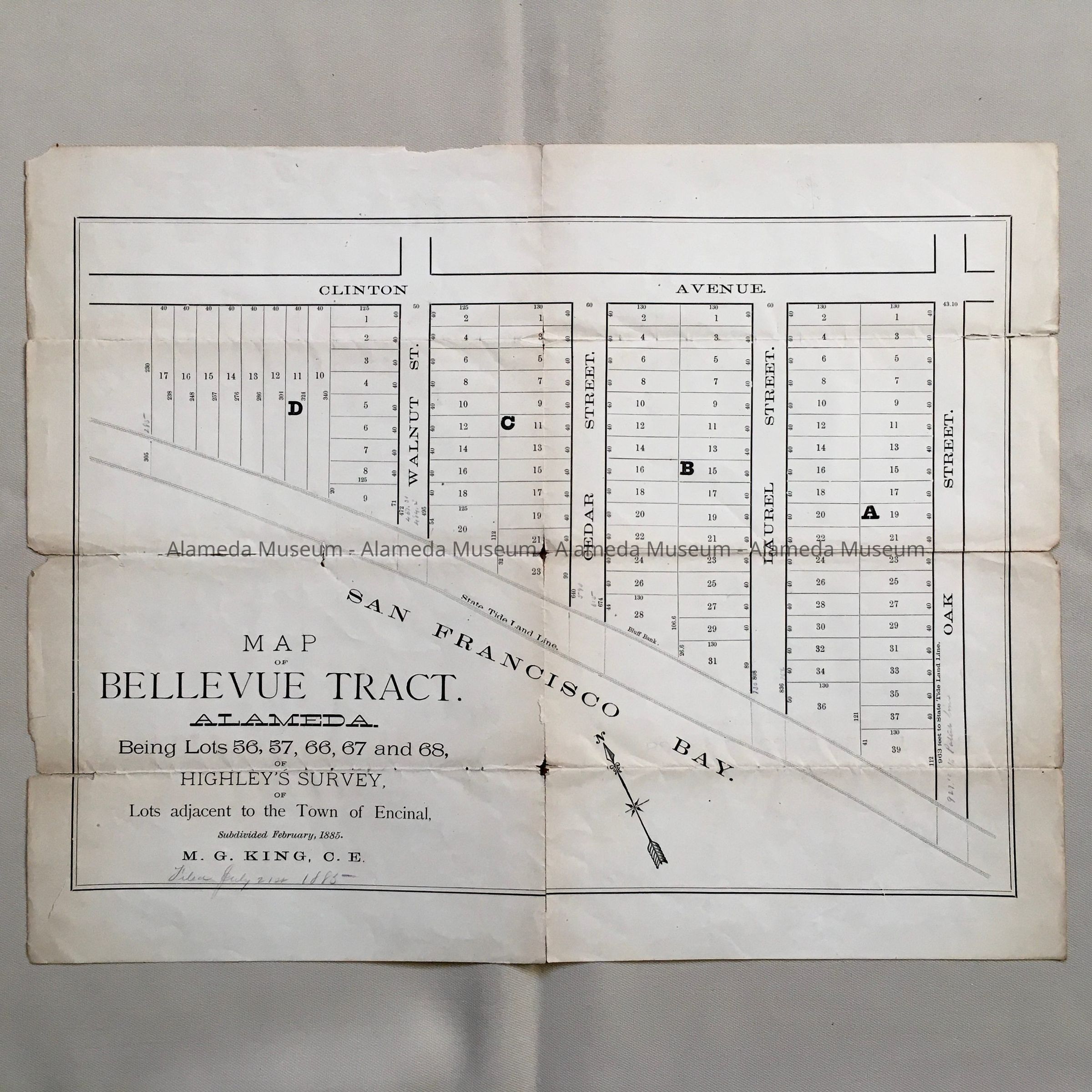 A REAL ESTATE SUBDIVISION MAP CREATED FOR THE SALE OF PROPERTY OF THE BELLEVUE TRACT LOCATED ON WALNUT, CEDAR, LAUREL, AND THE WEST SIDE OF OAK STREET BETWEEN CLINTON AVENUE AND TIDELANDS SUBDIVIDED, 1885.
