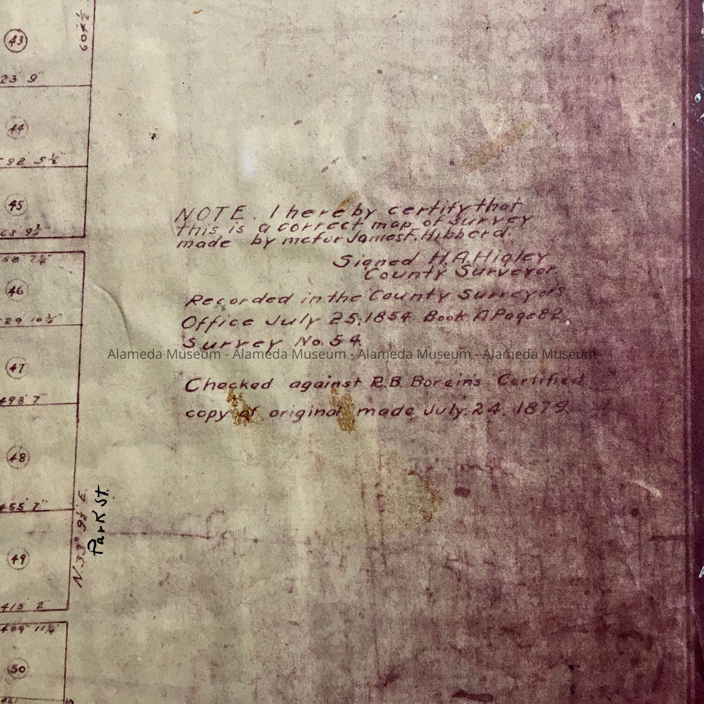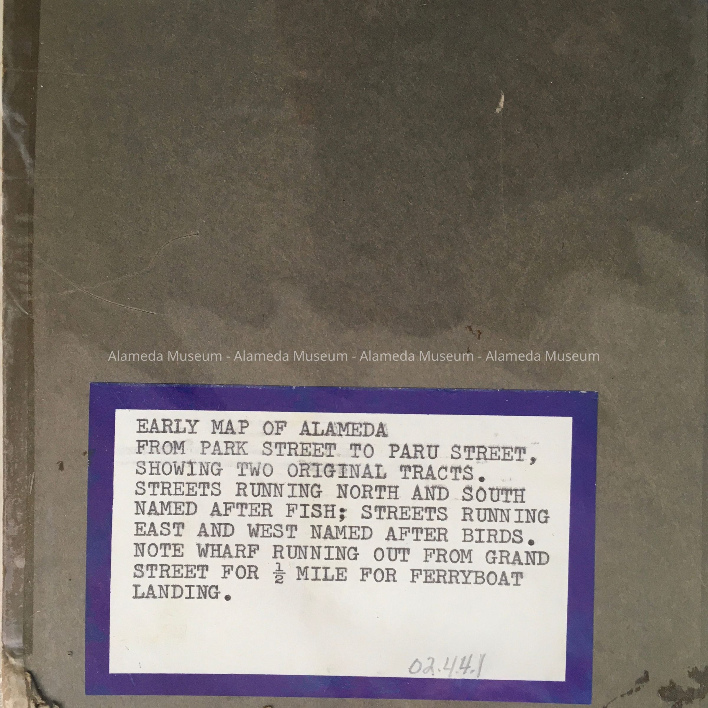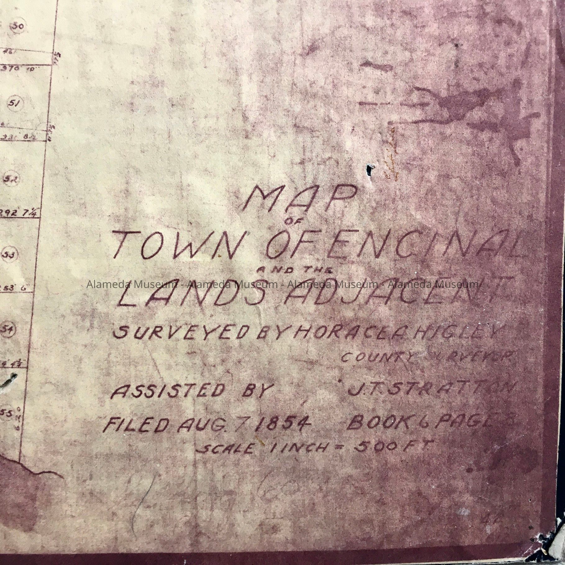 HISTORY OF OBJECT: MAP OF THE TOWN OF ENCINAL, WHICH WAS FILED ON AUGUST 7, 1854 AND COPIED ON JULY 4, 1879. THE MAP DEPICTS AN AREA BORDERED BY PARK STREET AND PARU STREET. UPPER PART OF THE MAP HAS THE ORIGINAL NAMES OF STREETS WHICH WERE NAMED AFTER SPECIES OF FISH (SUCH AS PIKE, TROUT, PERCH, ETC.)