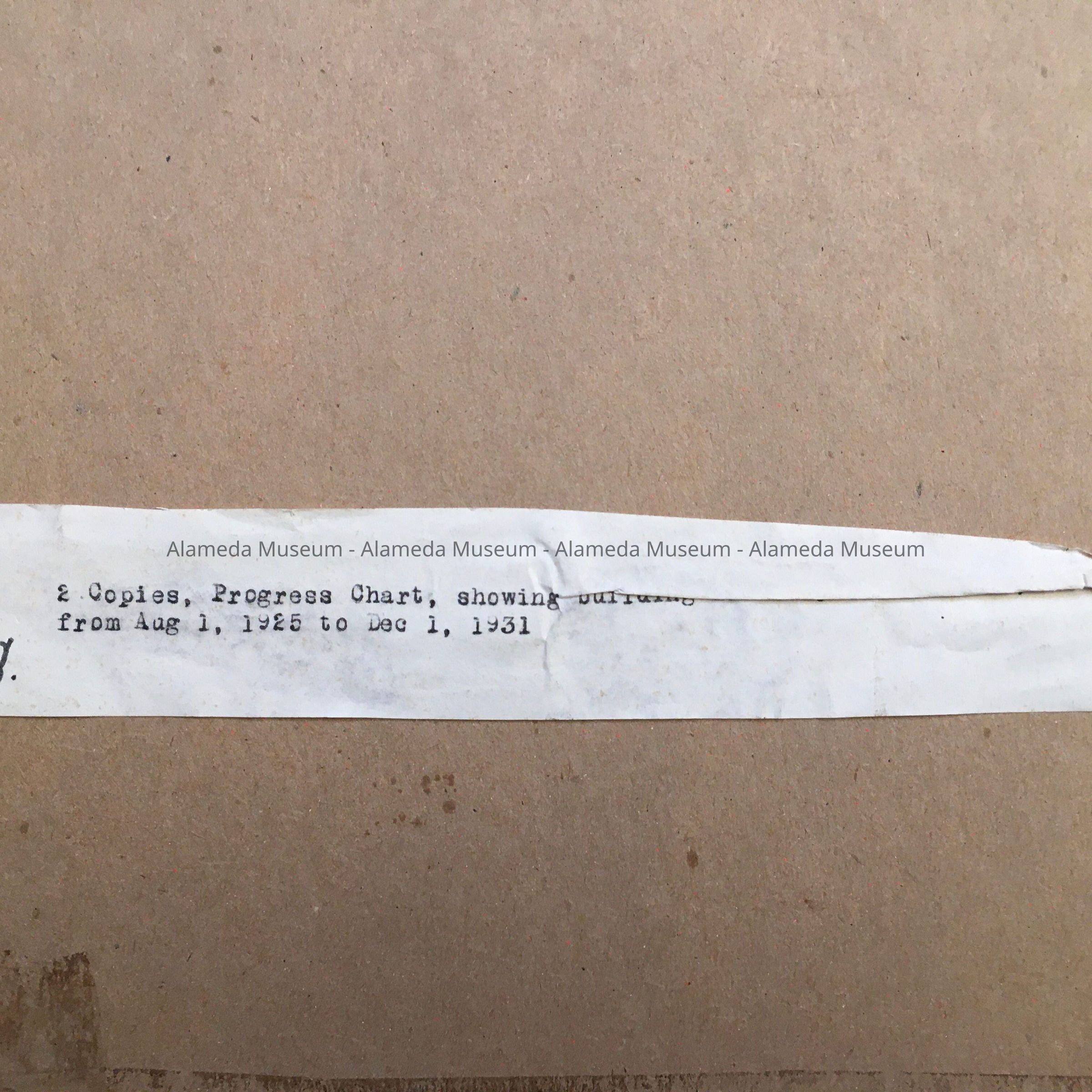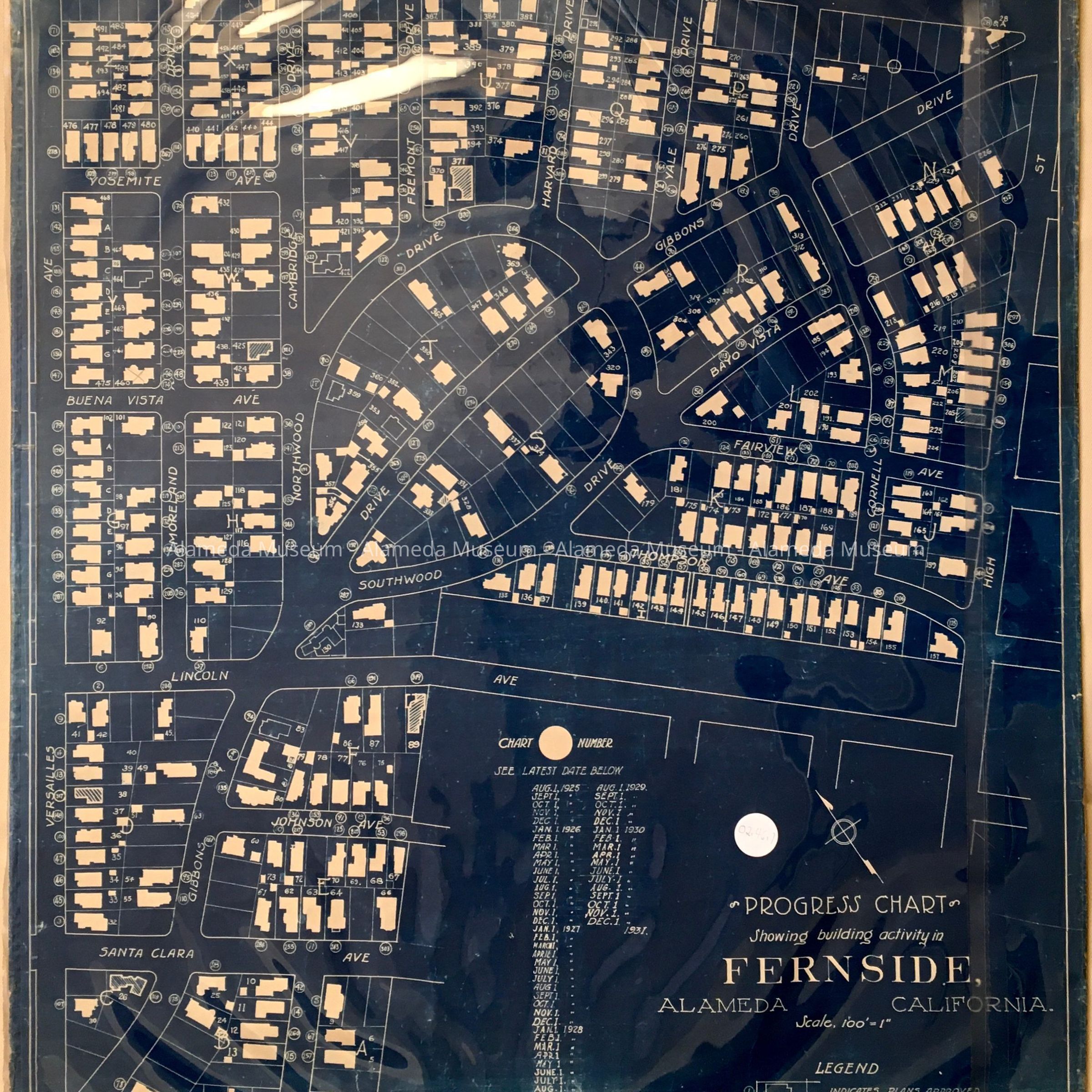 HISTORY OF OBJECT: SUBDIVISION MAP OR PROGRESS SHEET, SHOWING THE DEVELOPMENT OF THE FERNSIDE DISTRICT IN ALAMEDA FROM 1925 THROUGH DECEMBER 1, 1931. THE MAP DEPICTS INDIVIDUAL LOTS AND THE FOOTPRINTS OF THE HOUSES THAT HAD BEEN BUILT. THE PROPERTY IS BORDERED BY CENTRAL AVENUE, VERSAILLES STREET, HIGH STREET, AND FERNSIDE BOULEVARD.