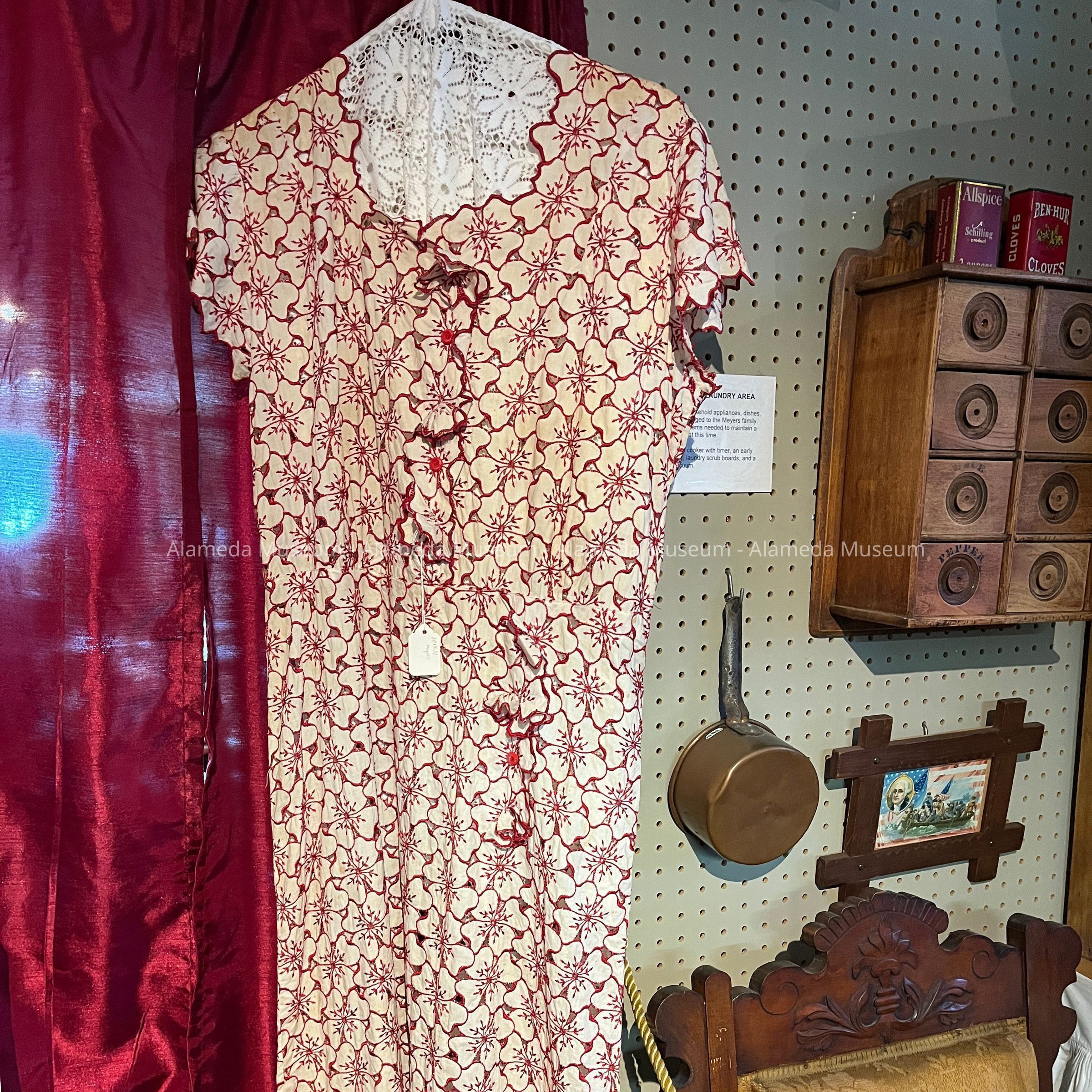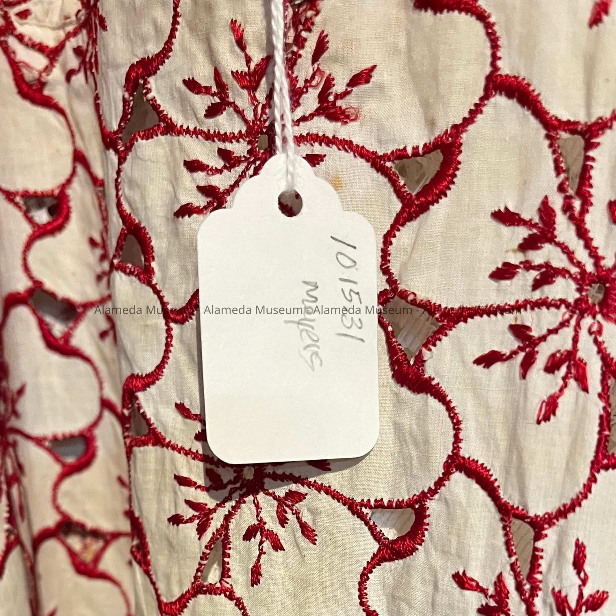 A ONE-PIECE SUMMER DRESS WITH A PATTERN OF EMBROIDERED FLOWERS. OPEN SPACES APPEAR BETWEEN FLOWER PETALS. OBVIOUSLY, A SLIP HAD TO BE WORN BENEATH THE DRESS. DRESS HAS A SIDE ATTACHMENT WITH SNAPS. BODICE IS TRIMMED IN RED PLASTIC BUTTONS. IT APPEARS TO BE A SIZE 14 AND WAS MOST LIKELY MANUFACTURED IN AMERICA.