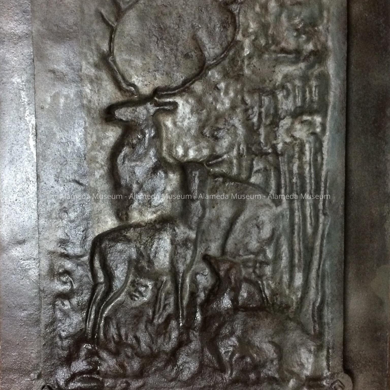Summer front in cast iron frame with woven basket weave pattern. Raised central motif of stag, doe, and fawn. Single button grip for removing from fireplace opening.