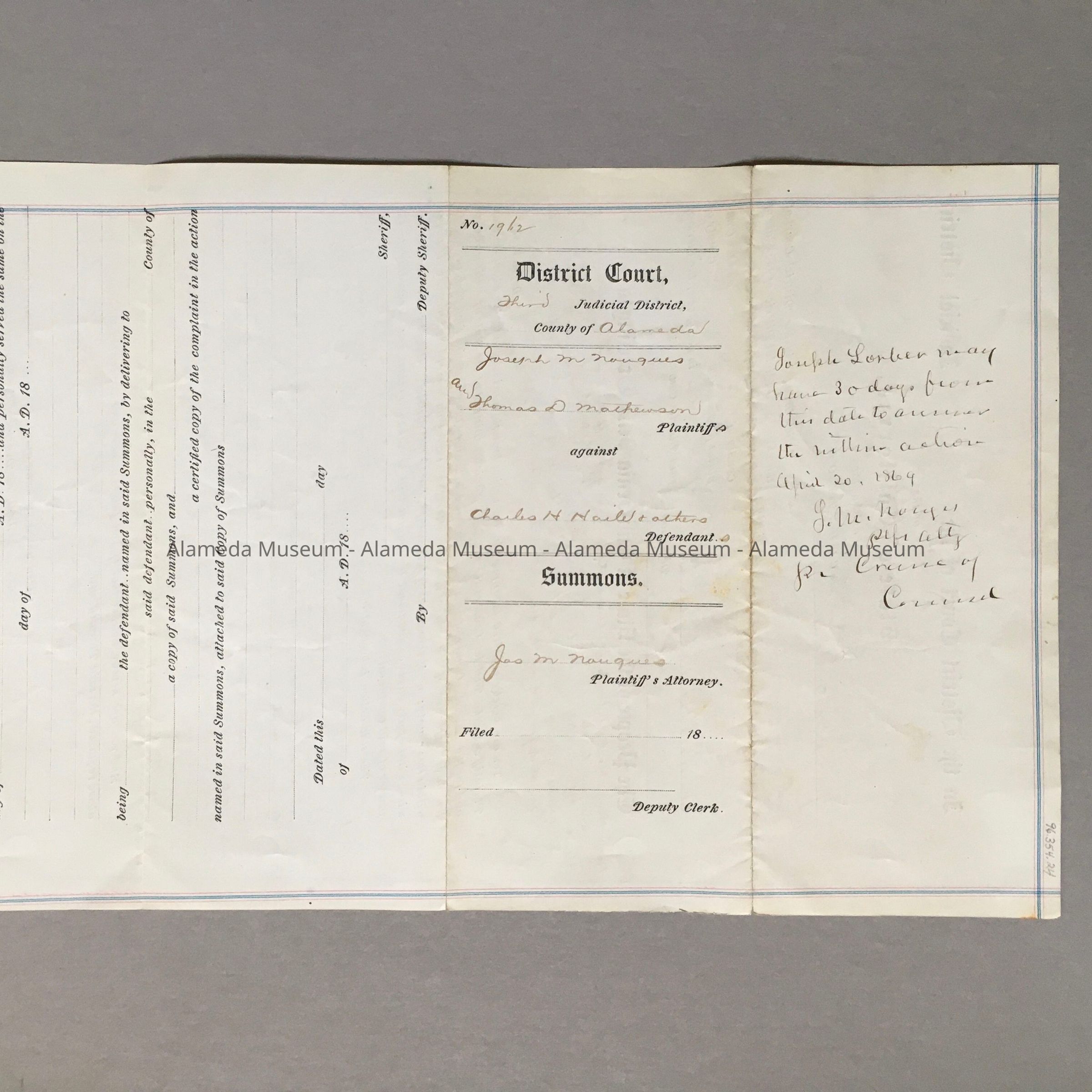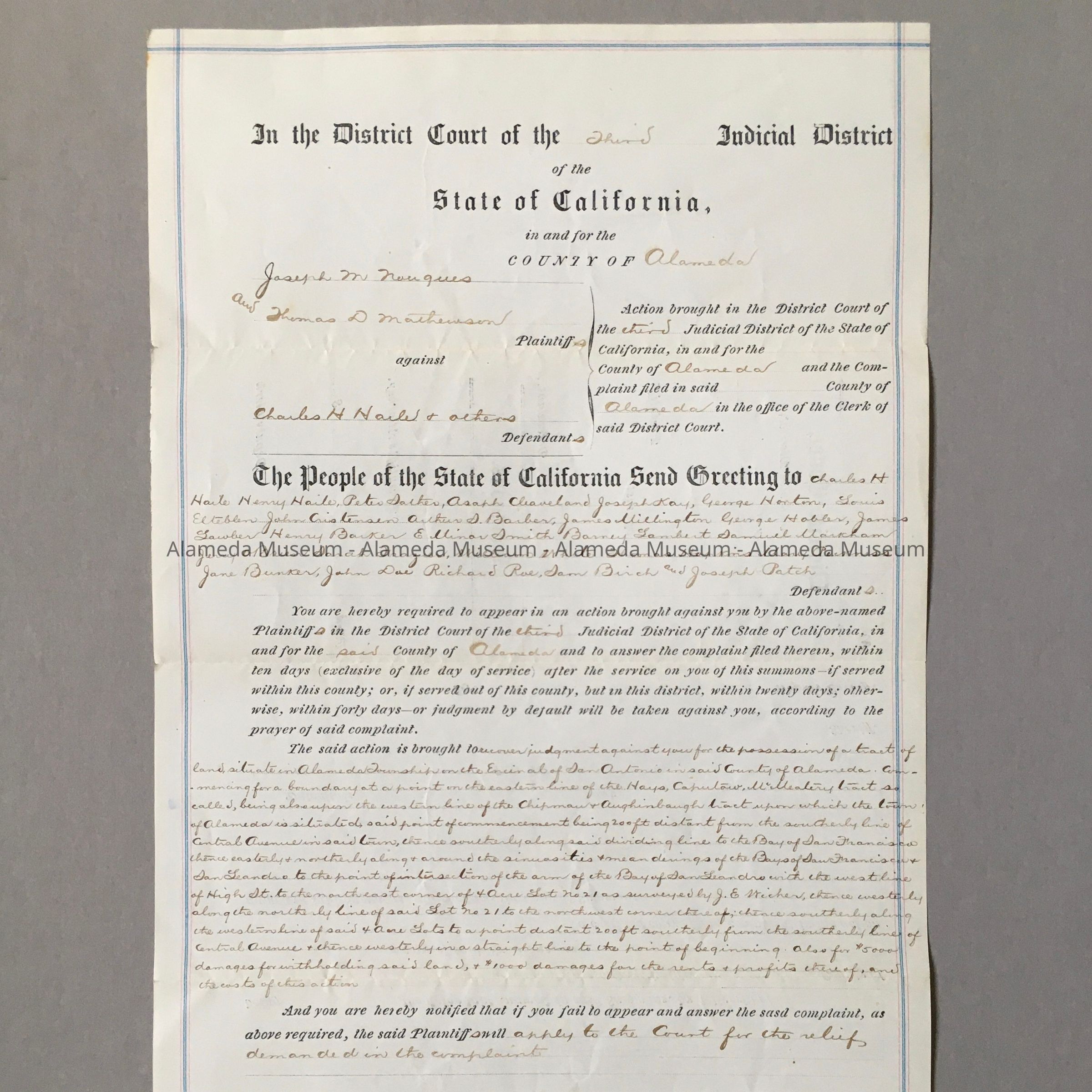 DISTRICT COURT, THIRD JUDICIAL DISTRICT, COUNTY OF ALAMEDA, CALIFORNIA SUMMONS FROM THE PLAINTIFFS, JOSEPH M NOUGUES AND THOMAS D MATHEWSON, AGAINST CHARLES H HALE AND OTHERS, DEFENDANTS. [OTHER EAST END PROPERTY OWNERS' NAMES ARE INCLUDED IN THE SUMMONS.] THE JUDGMENT IS TO RECOVER POSSESSION OF A TRACT OF LAND SITUATED IN THE ALAMEDA TOWNSHIP. IT APPEARS TO BE IN THE EAST END OF ALAMEDA, CALIFORNIA.