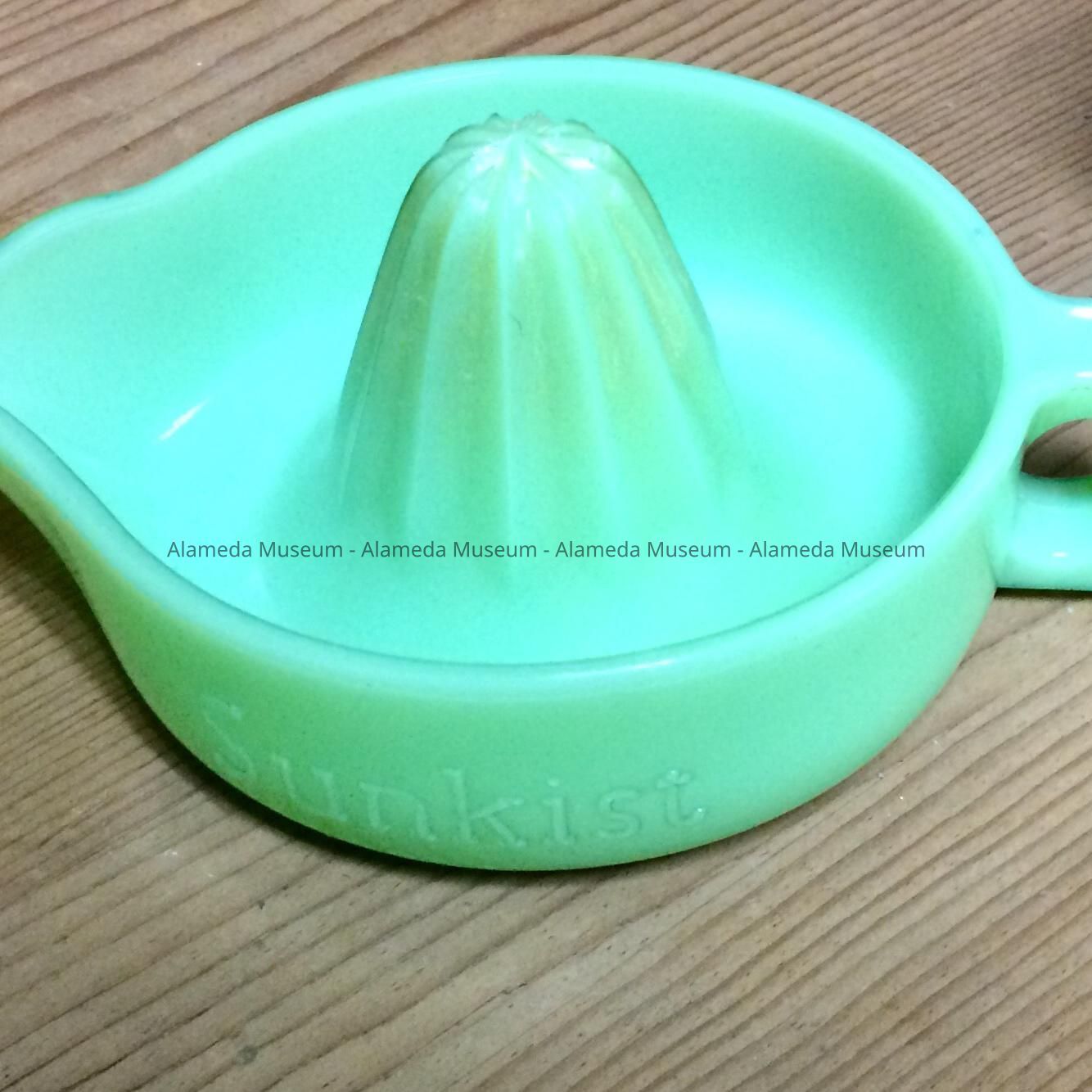 DESCRIPTION: AN OPAQUE GREEN GLASS FRUIT JUICER OF ONE-PIECE GLASS MANUFACTURE WHICH CONTAINS A SPOUT, HANDLE, RESERVOIR, AND GRATER. BOTH EXTERIOR SIDES OF THE BOWL HAVE RAISED LETTERING STATING, "SUNKIST."