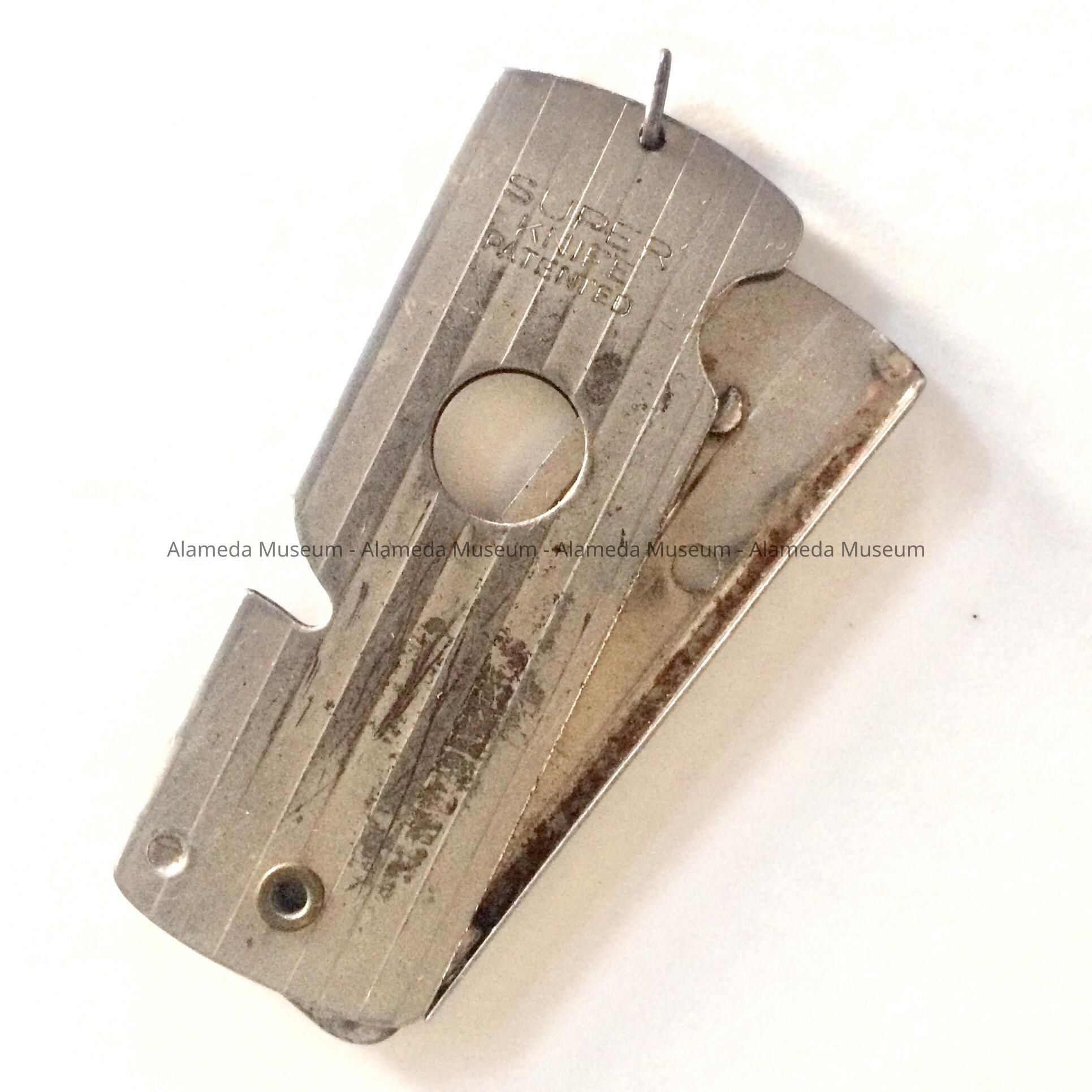 Description: A flat steel tool with alternating raised and low sections forming ribs, a loop at one end for attaching to a chain, a triangular gap on one side, a semi-circular indentation at the opposite side, and a circular hole in the center. The semi-circular indentation in the side enables pulling out of a swiveling knife blade, which enables accurate slicing off of objects inserted into the hole. Between the hole and the loop for hanging, is engraved: 'Super Knife Patented'.