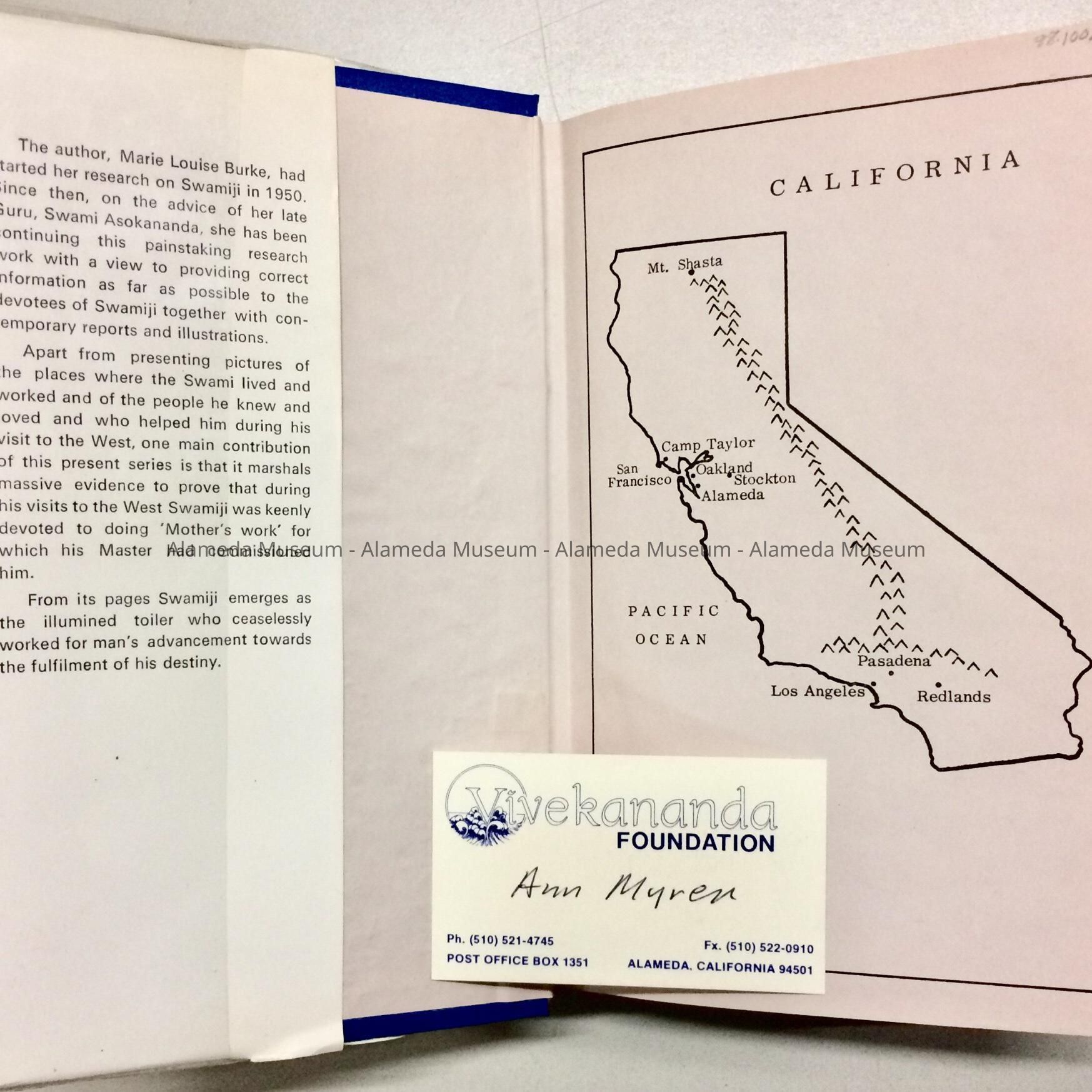 A BOOK WRITTEN BY MARIE LOUISE BURKE, AUTHOR OF THE BOOK --- "SWAMI VIVEKANANDA," WHO FOUNDED THE VEDANTA SOCIETY IN NORTHERN CALIFORNIA. THE BOOK DETAILS SWAMI'S STAY IN ALAMEDA, AS WELL AS THE PEOPLE WHOM HE MET IN ALAMEDA, CA.
