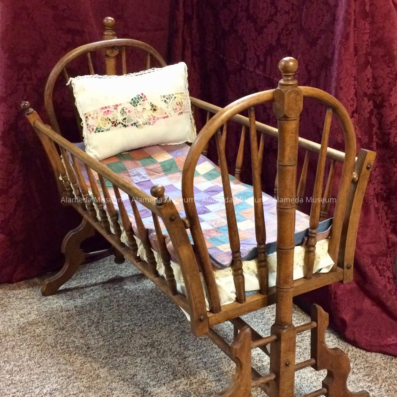 History of Object: A swinging wooden cradle dating back to the late 19th Century. It was used by an Alameda family prior to being given to the Testa family of Alameda for use by their children from 1904 to 1923. Donated by the daughter of the last child to use this cradle.
