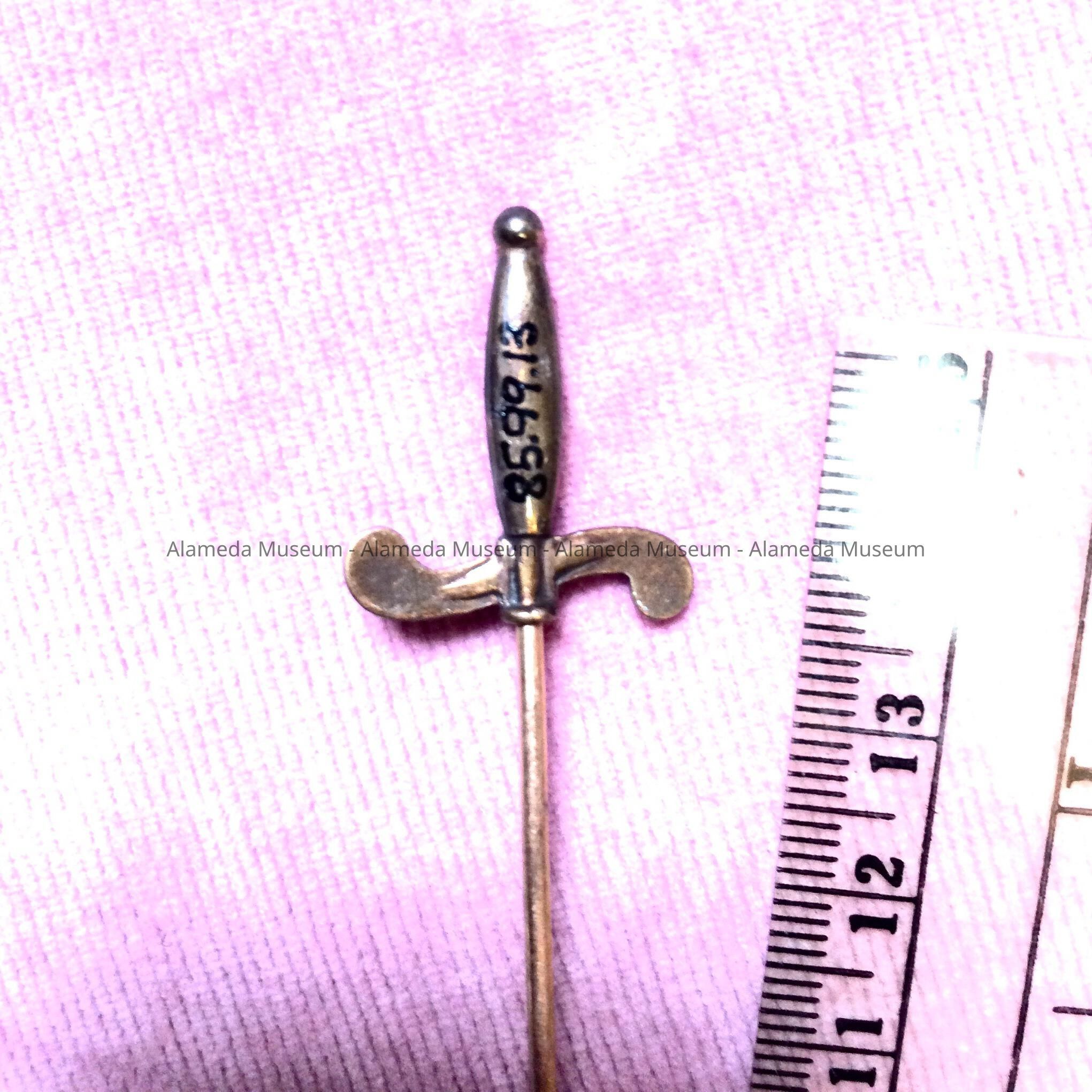 Decorative hat pin that originally belonged to Mrs. Samuel M. Haslett, 1605 Clinton Avenue. She was an old-time resident of Alameda.