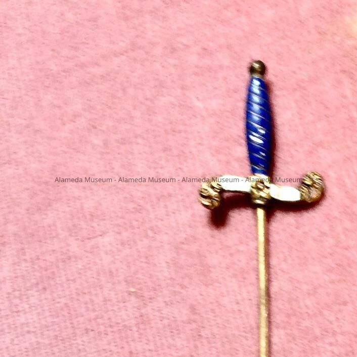 Hat pin with decorative top in the form of a sword grip with blue & white colored enameling on gold plated metal.