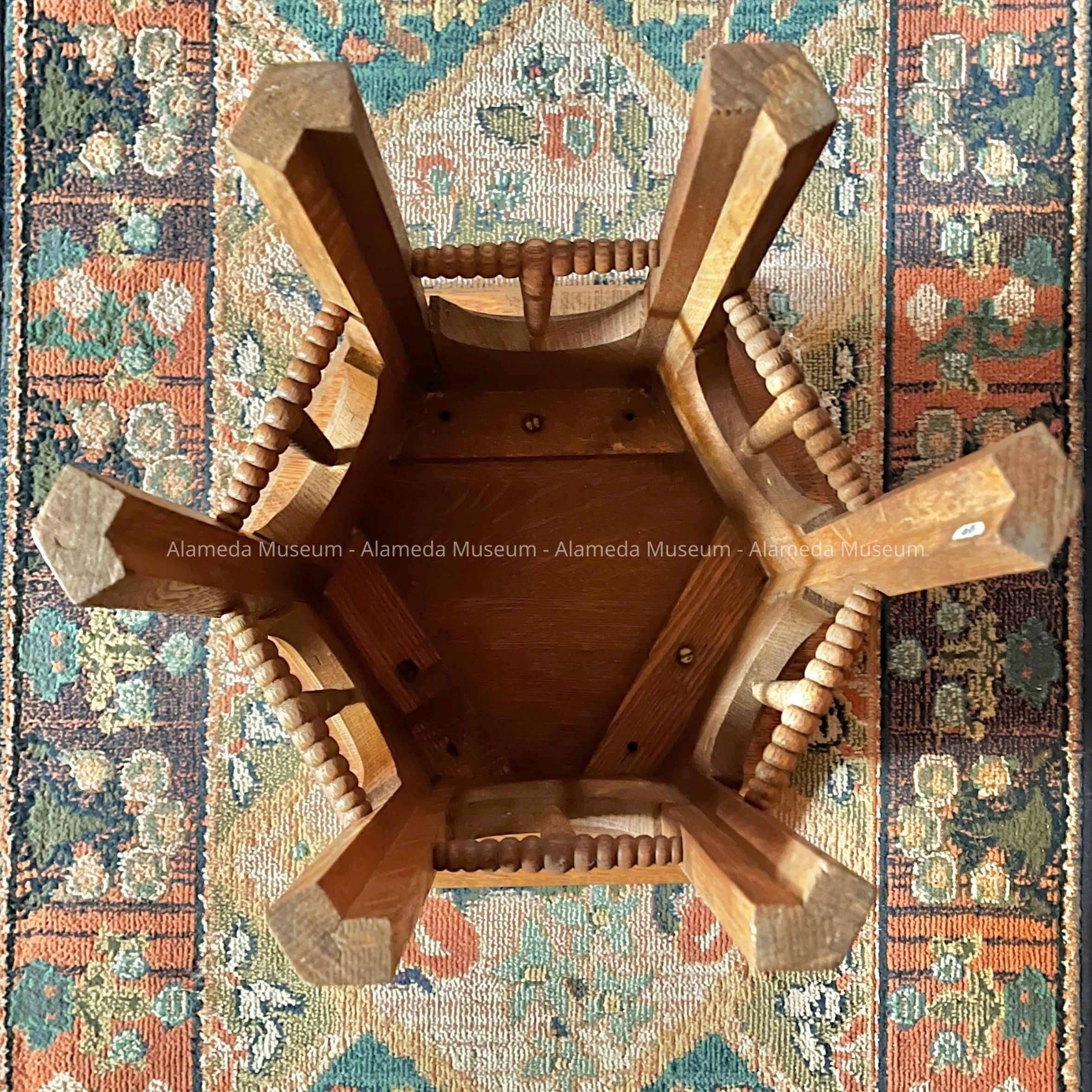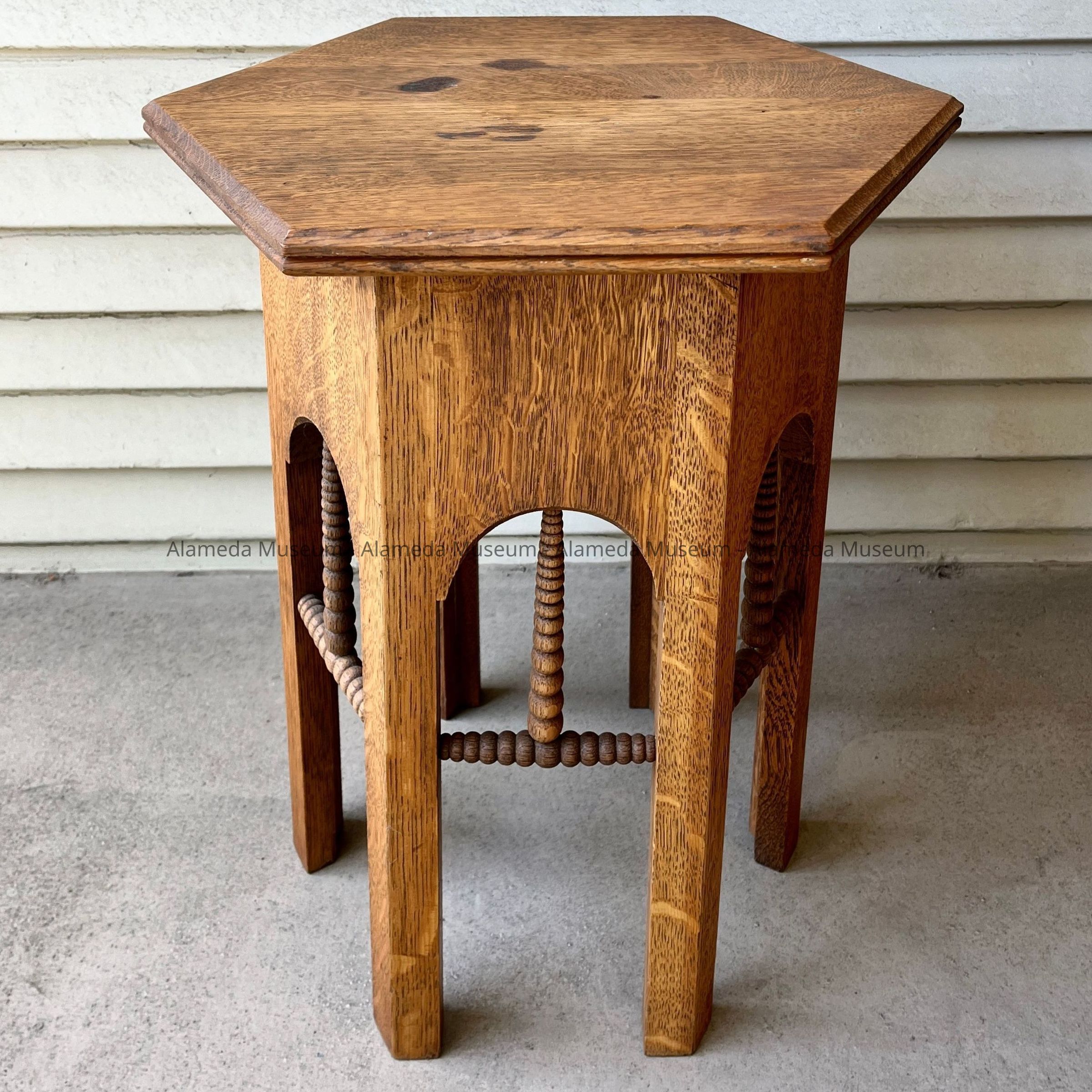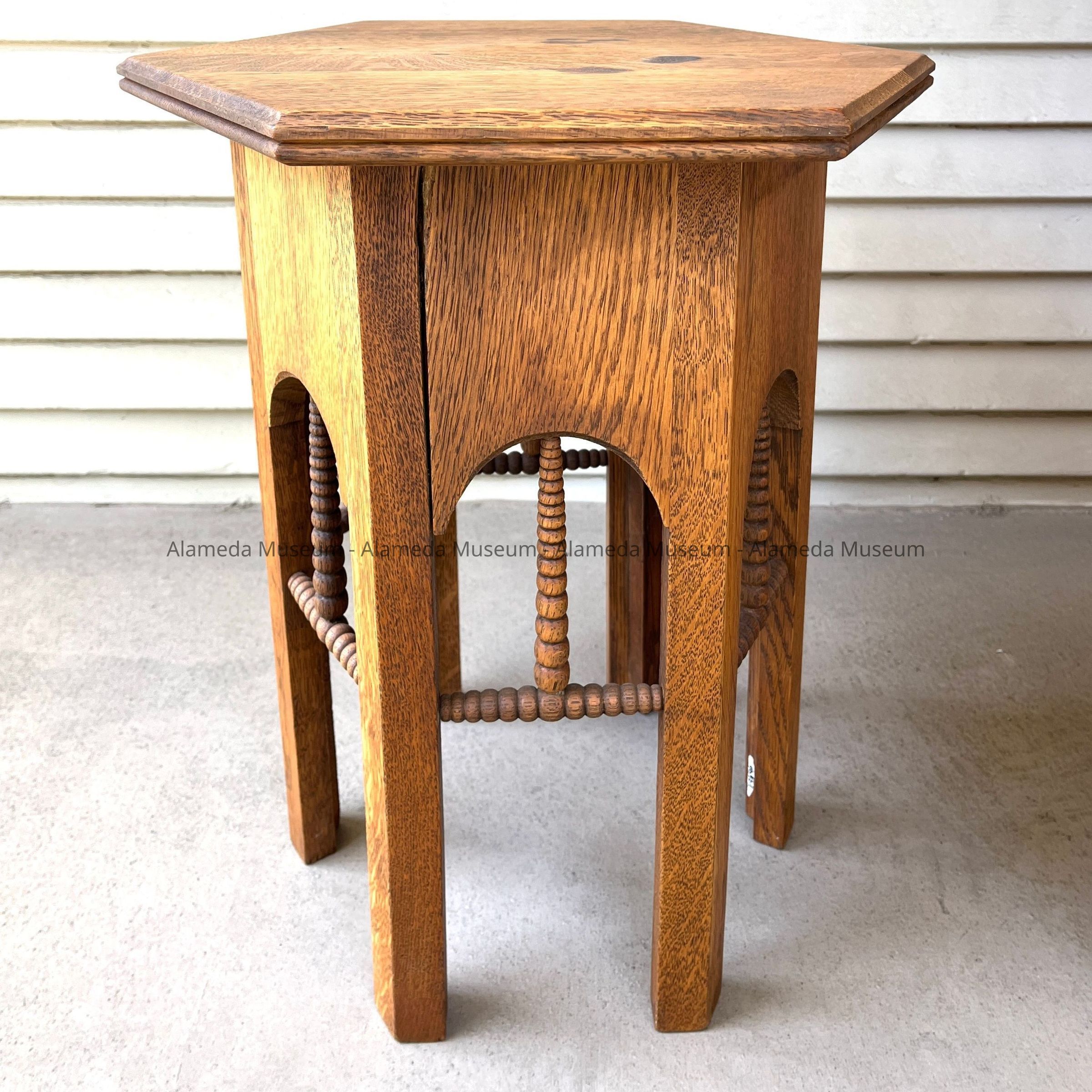 TABOURET TABLE FROM THE SAMUEL MONTGOMERY HASLETT RESIDENCE AT 1605 CLINTON AVENUE, ALAMEDA, CA. MR HASLETT WAS THE FATHER OF THE LATE DONOR, DORIS GOODMAN. OBJECT ORIGINALLY GIVEN IN THE 1980's. UNCATALOGED AND RECENTLY RESTORED BY REMOVAL OF GREEN PAINT.