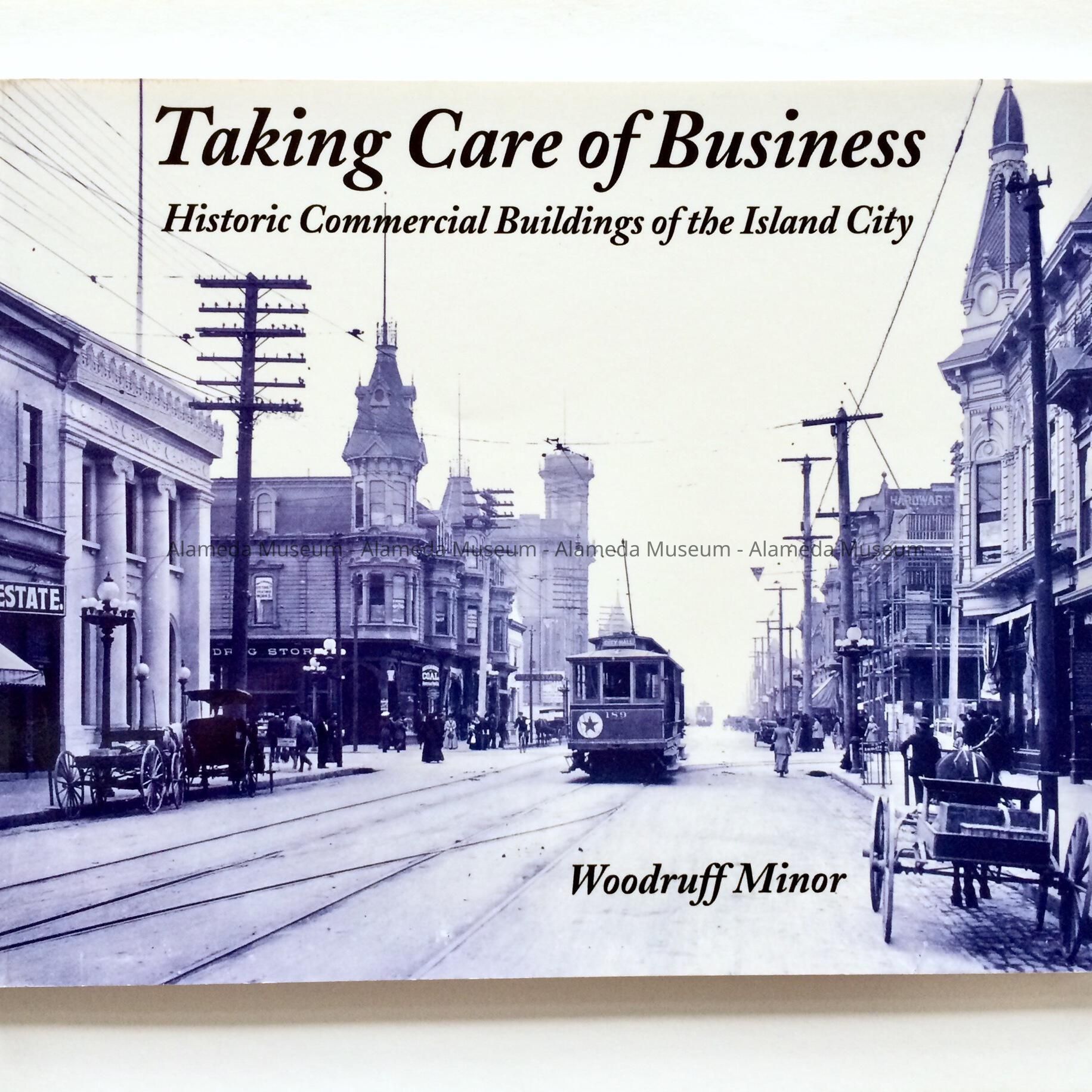Description: softbound book with glossy card stock paper cover, featuring an image of trollies riding through a street. Title 'Taking Care of Business - Historic Commercial Buildings of the Island City'.