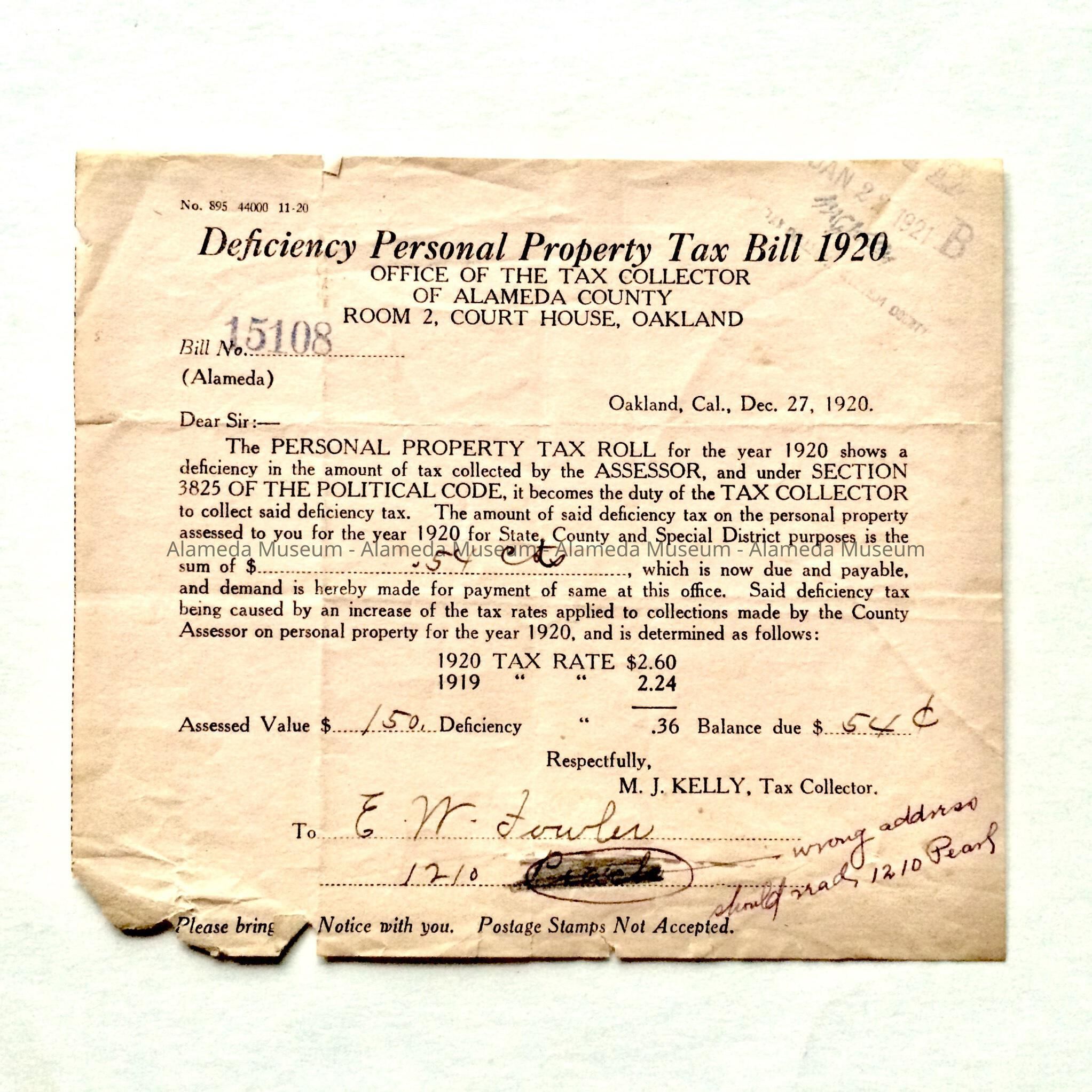 A FORM CONCERNING AN ASSESSMENT FOR PERSONAL PROPERTY OF EDWARD FOWLER, 1210 PEARL STREET, ALAMEDA, ISSUED BY THE OFFICE OF THE TAX COLLECTOR, CITY OF ALAMEDA.