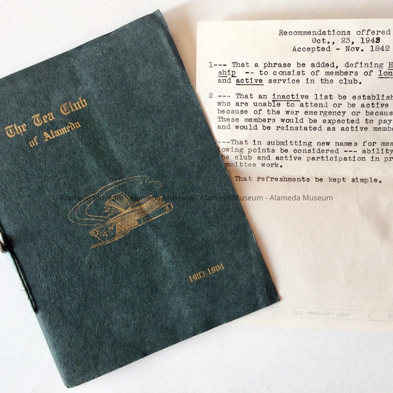 Description: A. Roster booklet bound by a string, with cover of dark green card stock, printed with an image of a tea cup and books, titled 'The Tea Club of Alameda', '1903-1904', B. typed sheet with 4 items, titled 'Recommendations offered Oct., 23, 1942; Accepted - Nov. 1842'