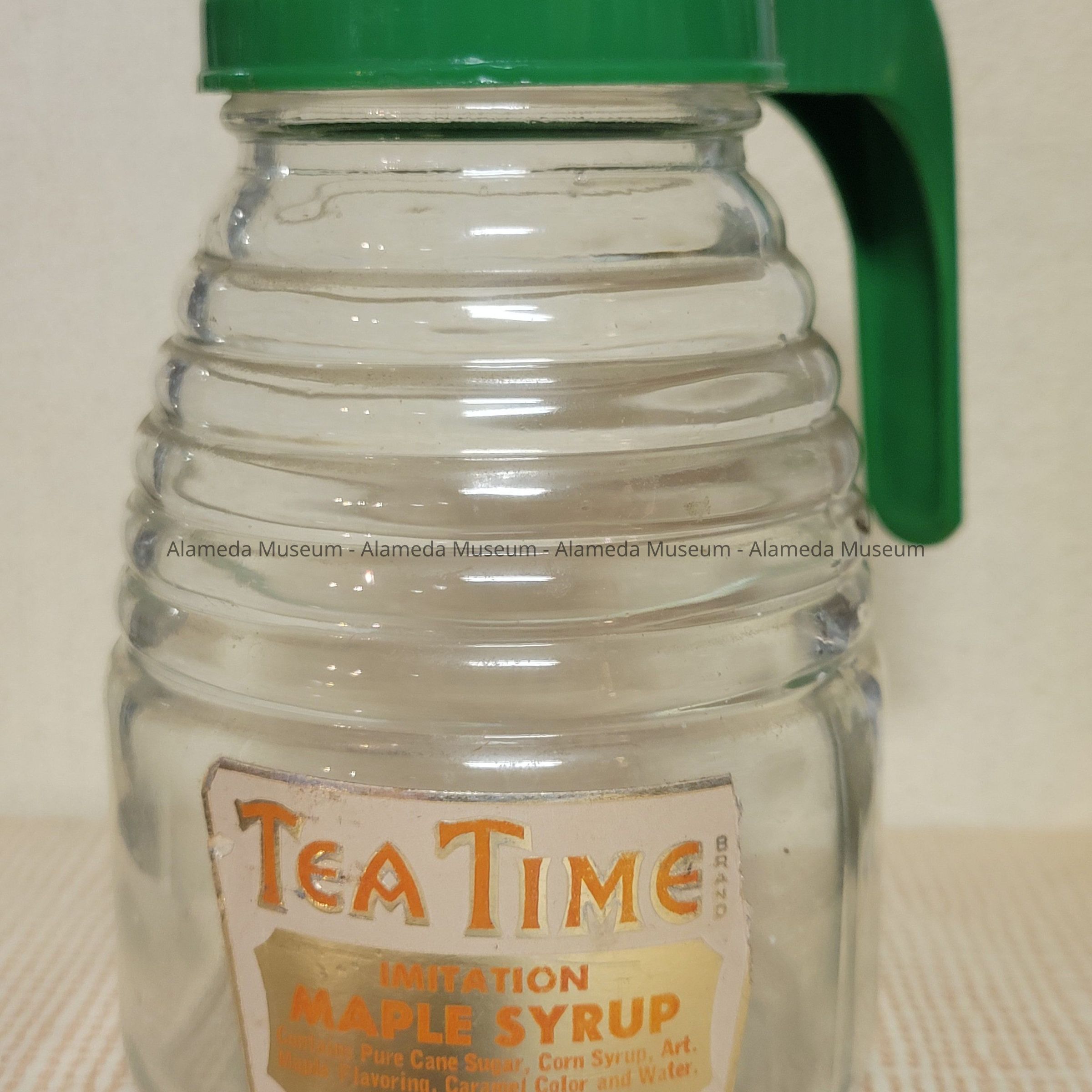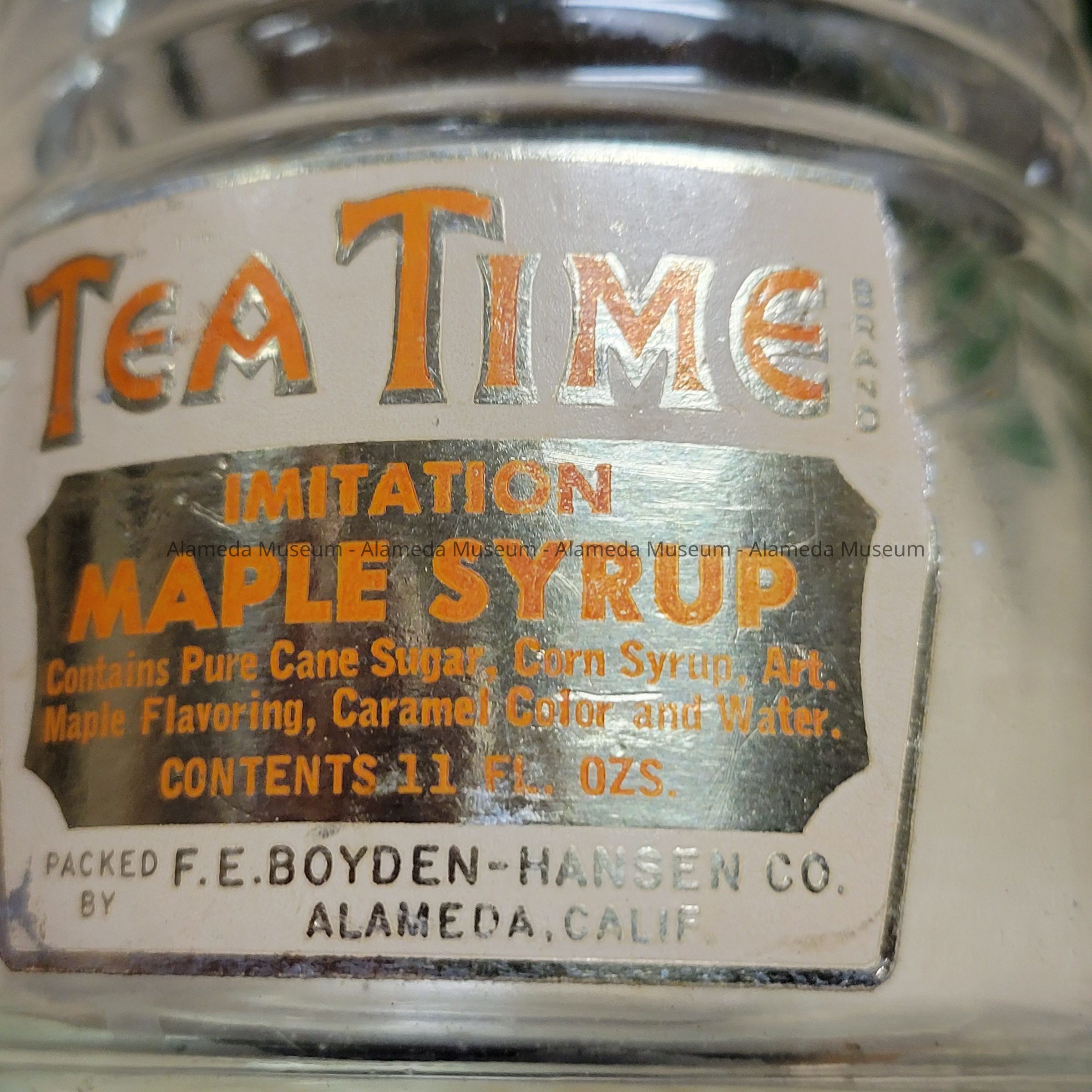 Description: Clear glass syrup dispenser with a green plastic top and handle, art-deco styling. Has a paper label with “Tea Time” written in orange and outlined in silver. Also, “imitation maple syrup” with listing of ingredients and 11 fl. ounces is written in orange on a silver background. “Packed by F.E. Boyden- Hansen Co. Alameda, Calif” is written in silver at the bottom edge of the label.
