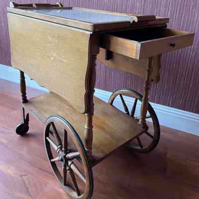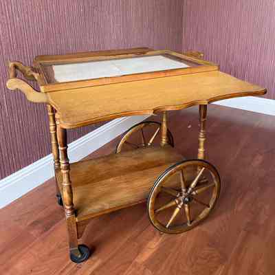 Description: A wooden tea cart (perhaps walnut?) with 2 larger back wheels and two small metal casters on the other side, a scrolled handle, a drop-leaf on the long sides, and a wood and glass tray with handles on the short sides which fits over the top of the cart. The legs and spokes of the bigger wheels are lathe-turned, and the drop-leaves have scrolled edges. The hinged leaves fold out supported by metal arms which have springs to keep them in place. A small drawer, lined with black velvet, is fitted under the top.