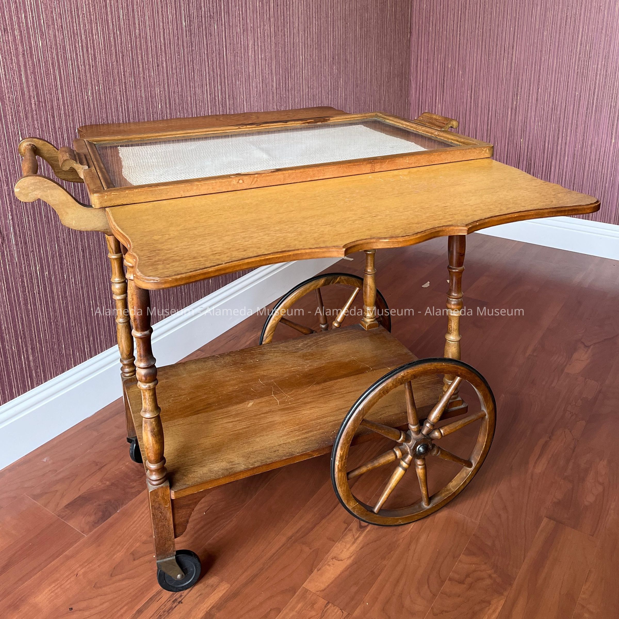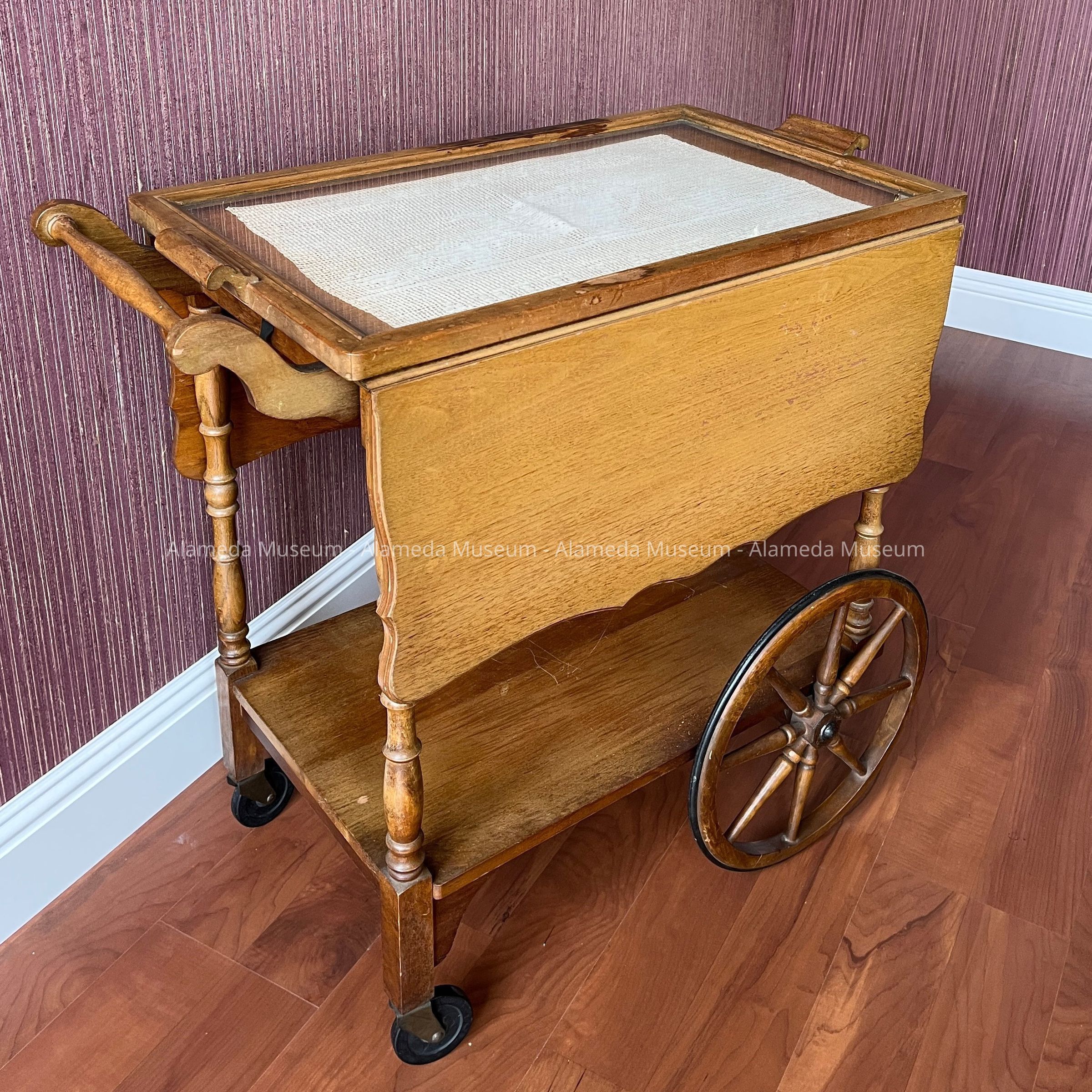 History of Object: tea cart originally owned by Edward K. Taylor, the first Mayor of Alameda (1907-1909), and was at his home on Central Avenue, west of Grand St., one of the oldest homes in Alameda. E.K. Taylor was a son of Bishop Taylor, who introduced Eucalyptus trees to California.