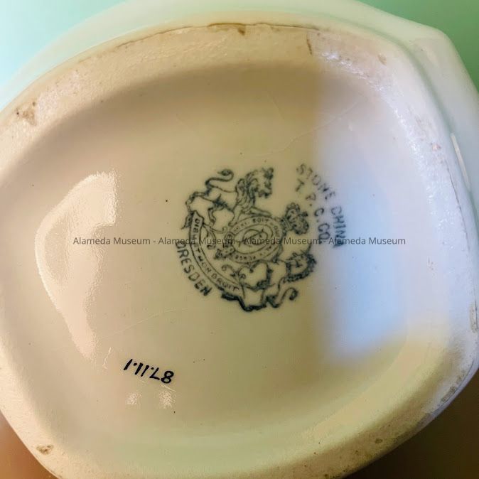 Description: Semi porcelain teapot with transfer designs consisting of sprigs of pink blossoms (accentuated by hand painting). Spout, lid, and rim accentuated with gold. Elaborate pseudo English mark on base (most likely of American origin) with wording "Stone China, T. P. C. Co." & pattern name "Dresden."