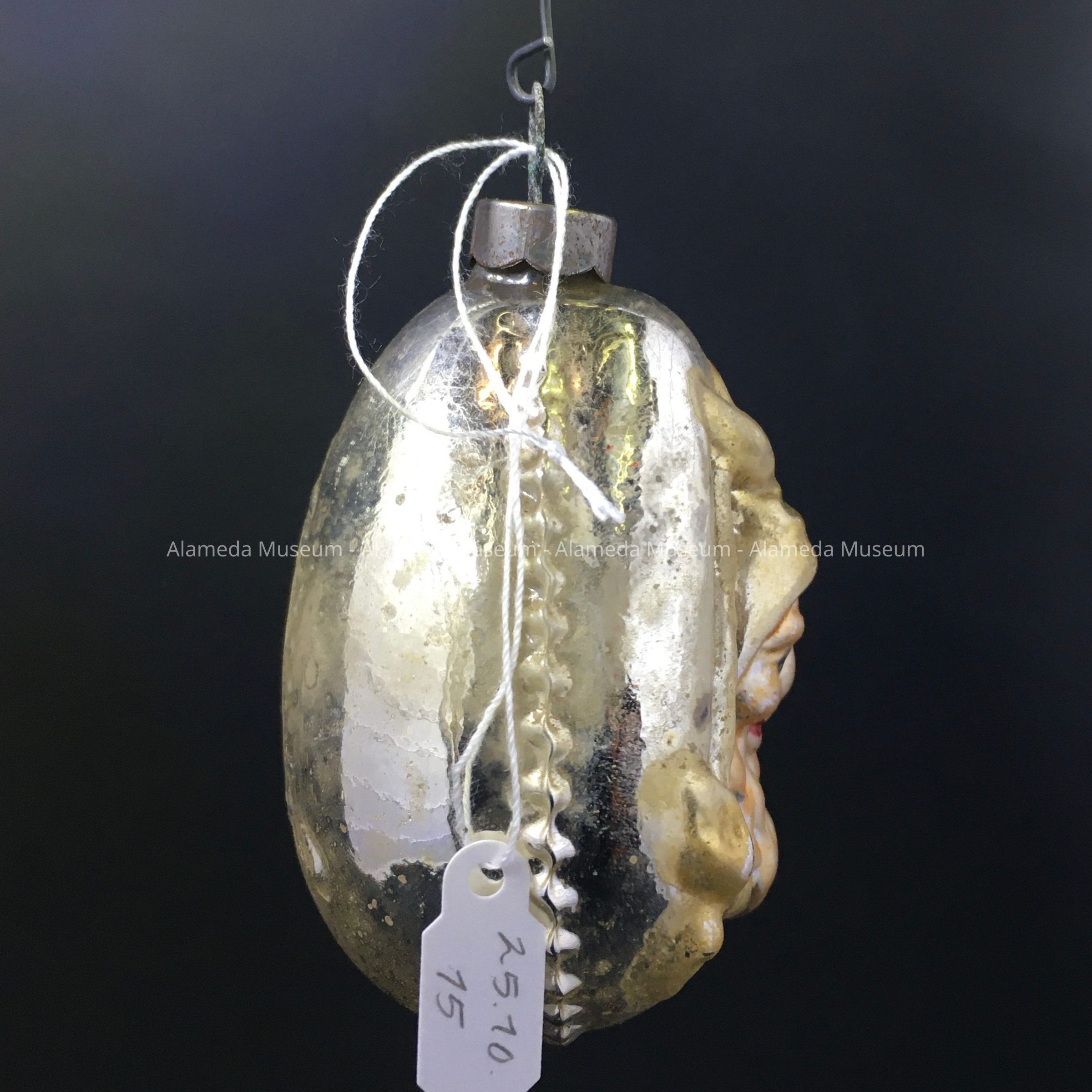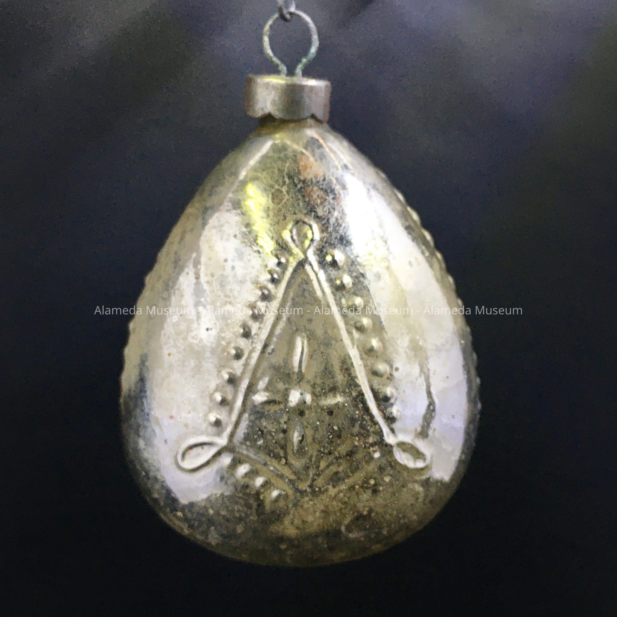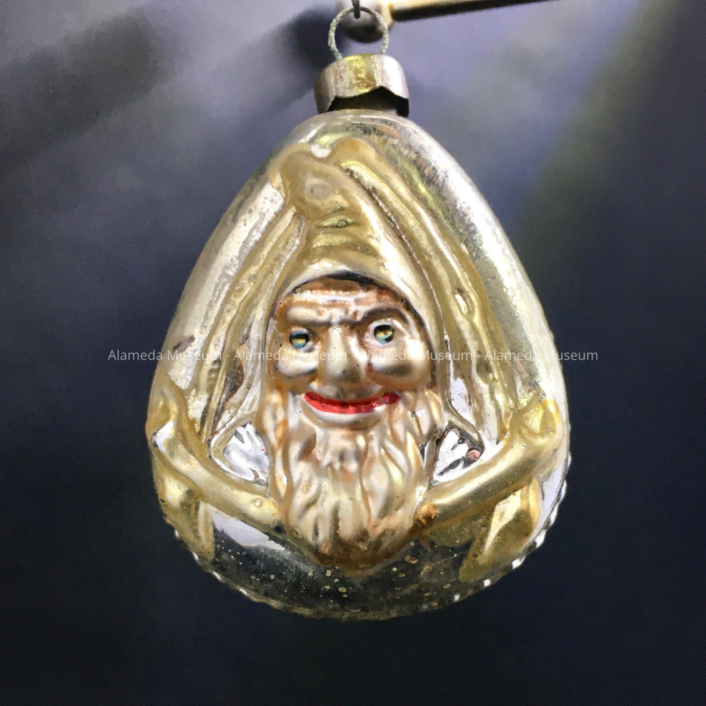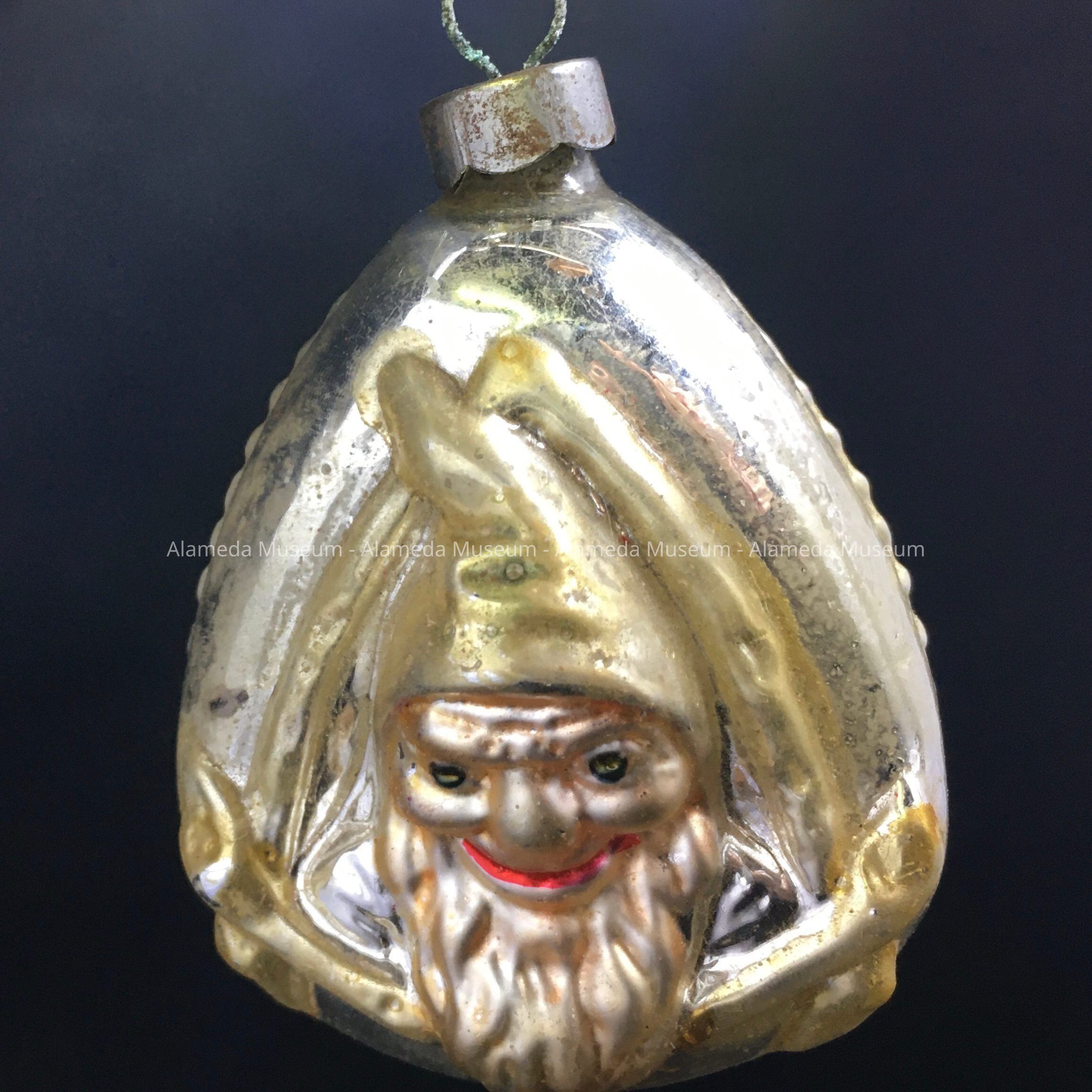 Description: A flattened teardrop-shaped, glass ornament of gold-and silver with the relief of the head and shoulders of a dwarf with pointed hood or cap, on one side, and an upside-down kite-shape decoration on the other.
