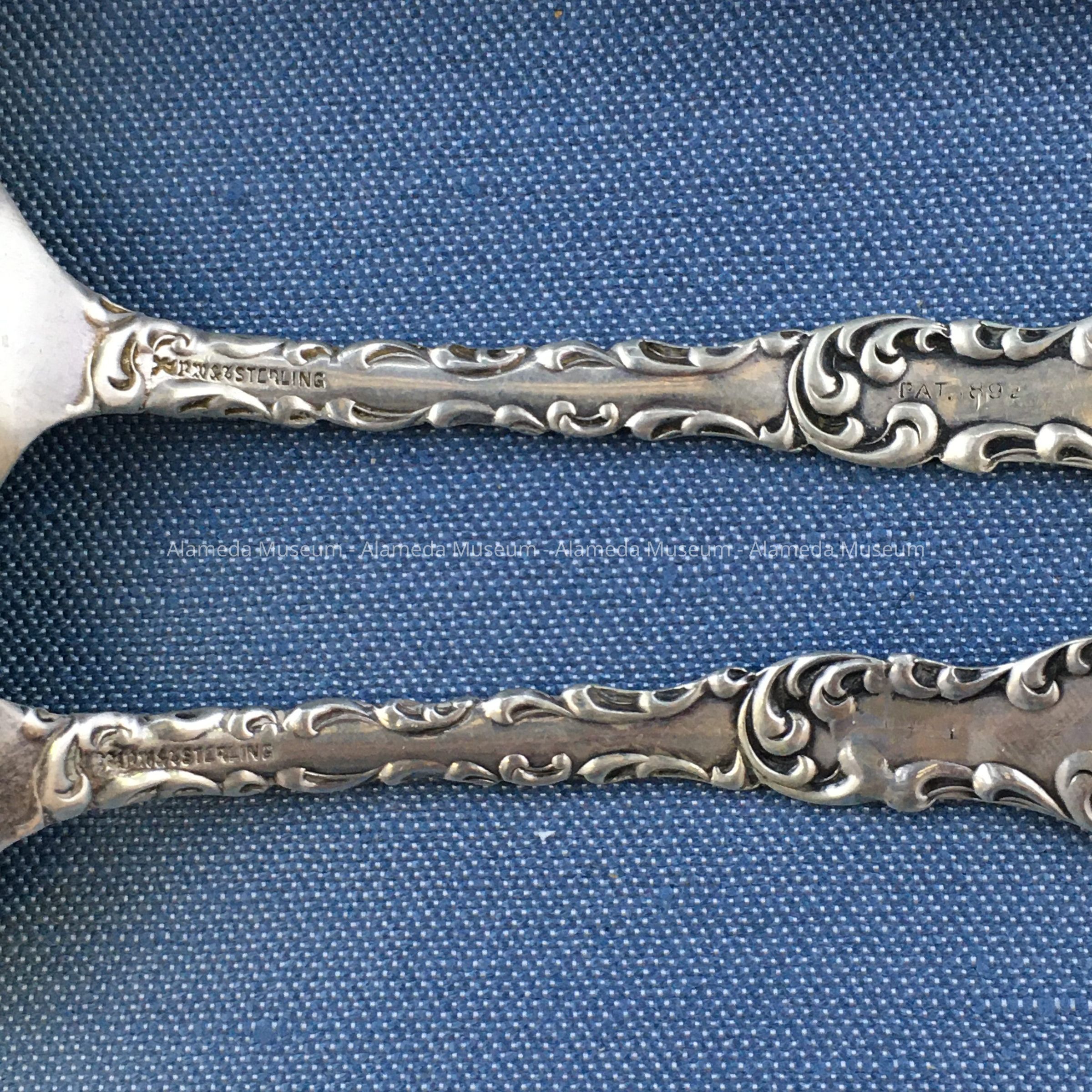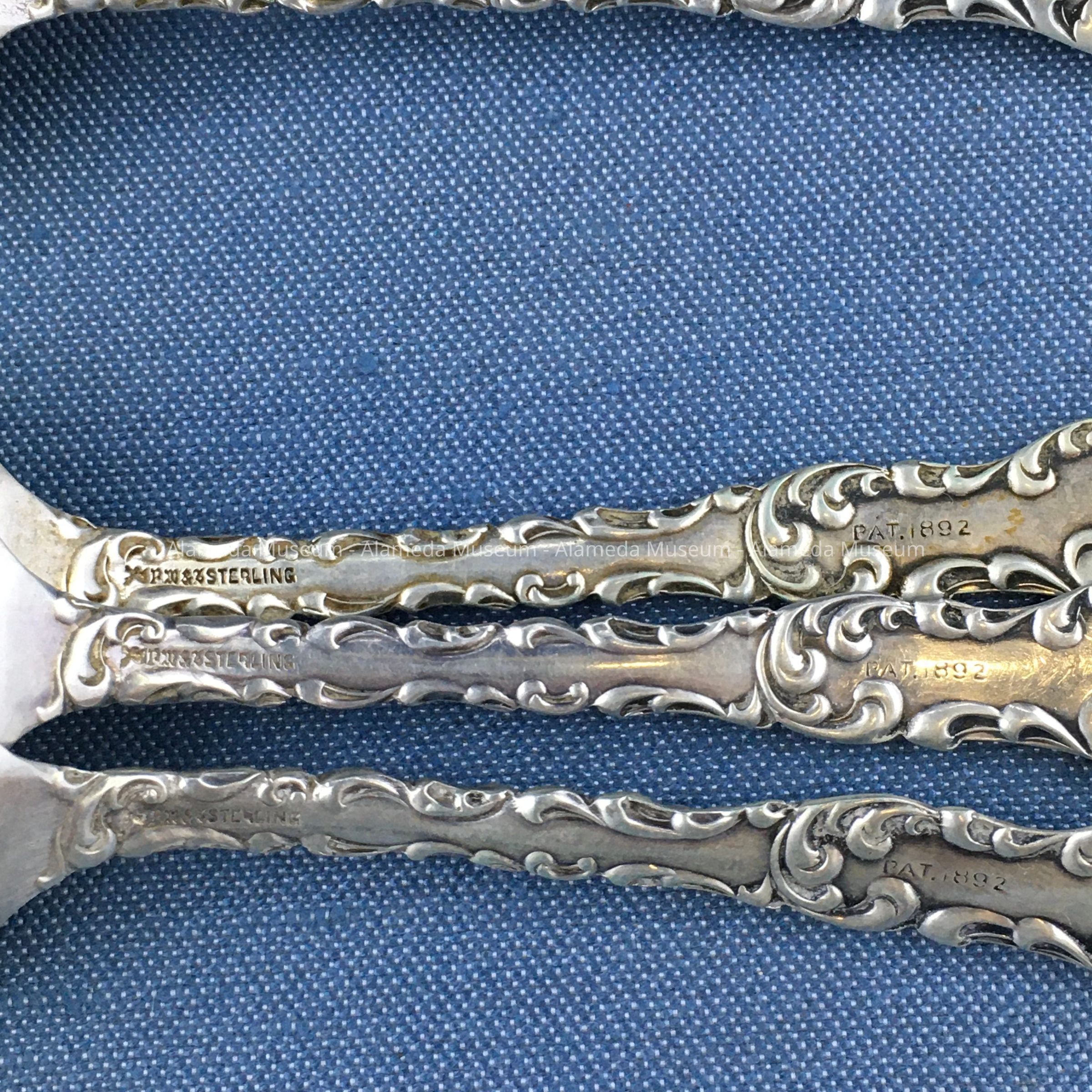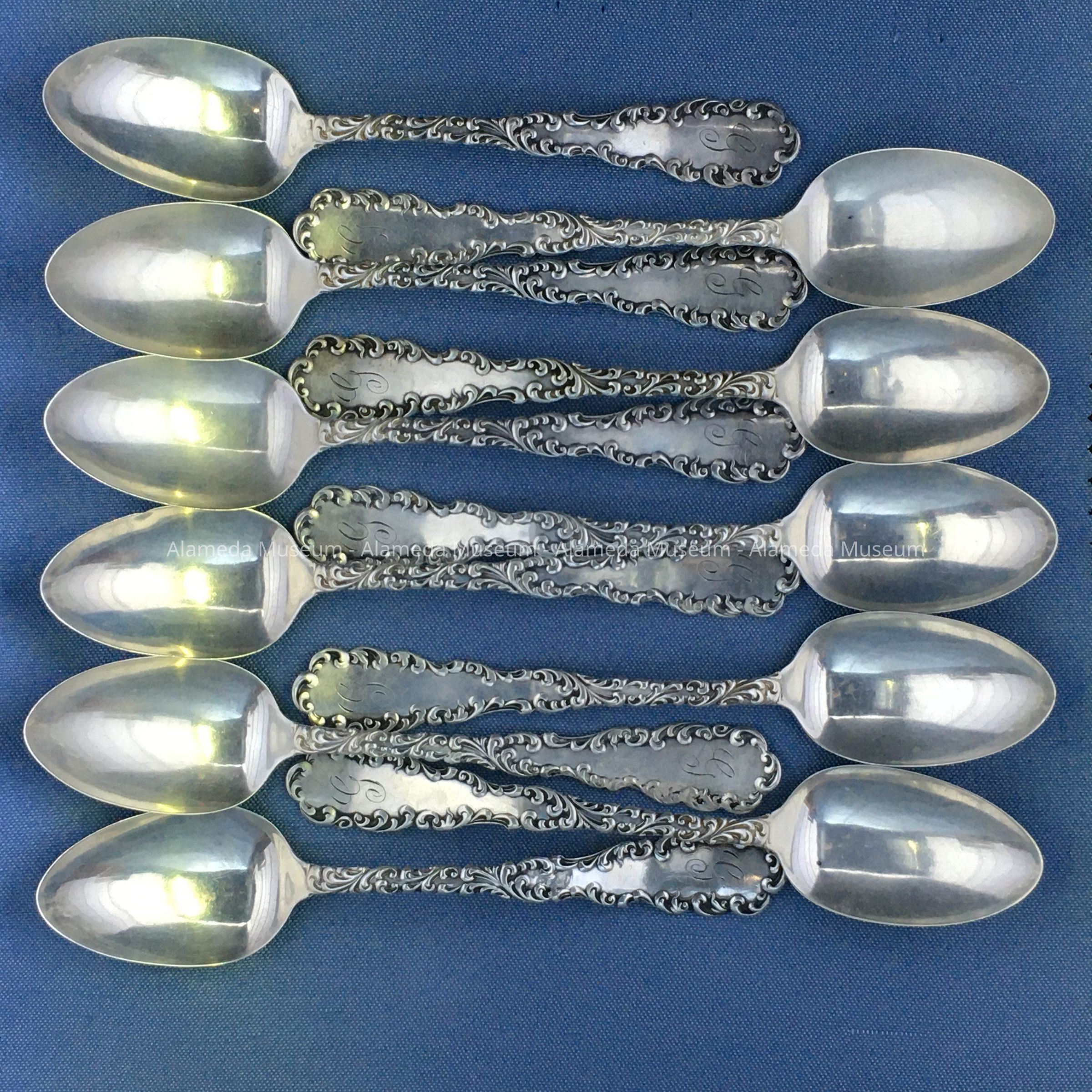 11 matching teaspoons with decorative designs in repossee, engraved with the initial "G." Marked "Sterling-Pat. 1892."