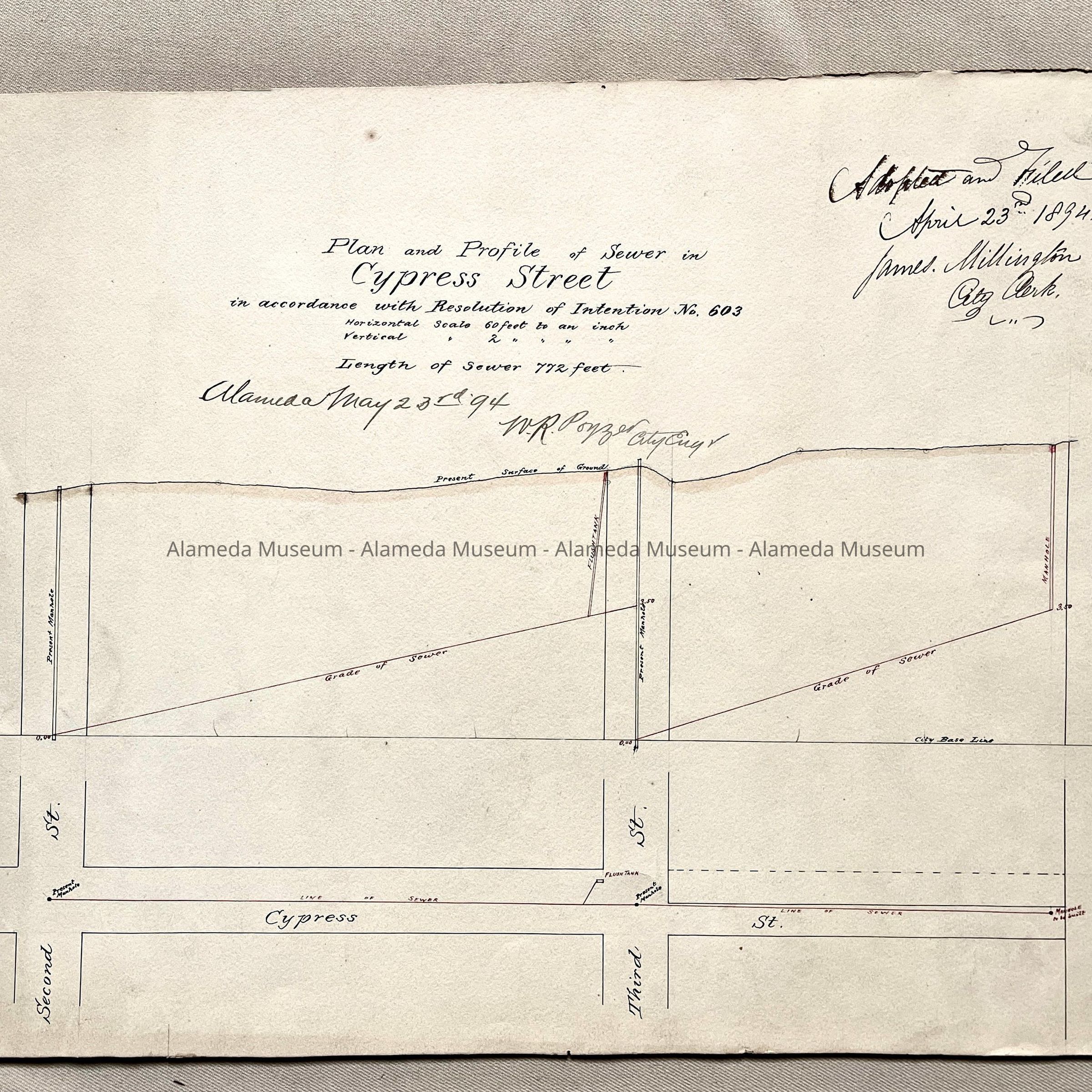 HAND-DRAWN PLAN AND PROFILE OF A SEWER ON CYPRESS STREET, IN ACCORDANCE WITH (IAW) A RESOLUTION OF INTENTION #603, SUBMITTED BY W R POYZER, CITY ENGINEER, AND DATED MAY 23, 1894. IT WAS ADOPTED ON APRIL 23, 1894 BY JAMES MILLINGTON, CITY CLERK.
