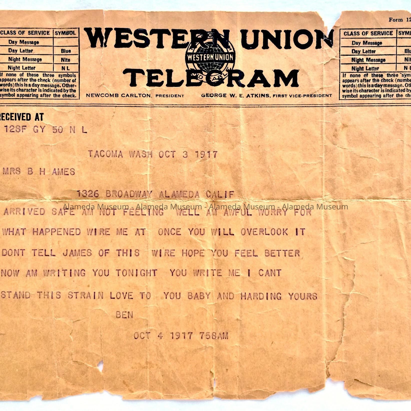 HISTORY OF OBJECT: A TELEGRAM ADDRESSED TO MRS. B. H. AMES, 1326 BROADWAY, ALAMEDA, FROM "BEN," STATIONED IN TACOMA, WASHINGTON DURING WW-I.