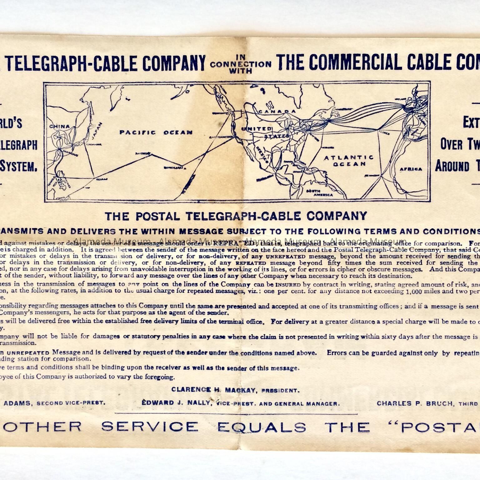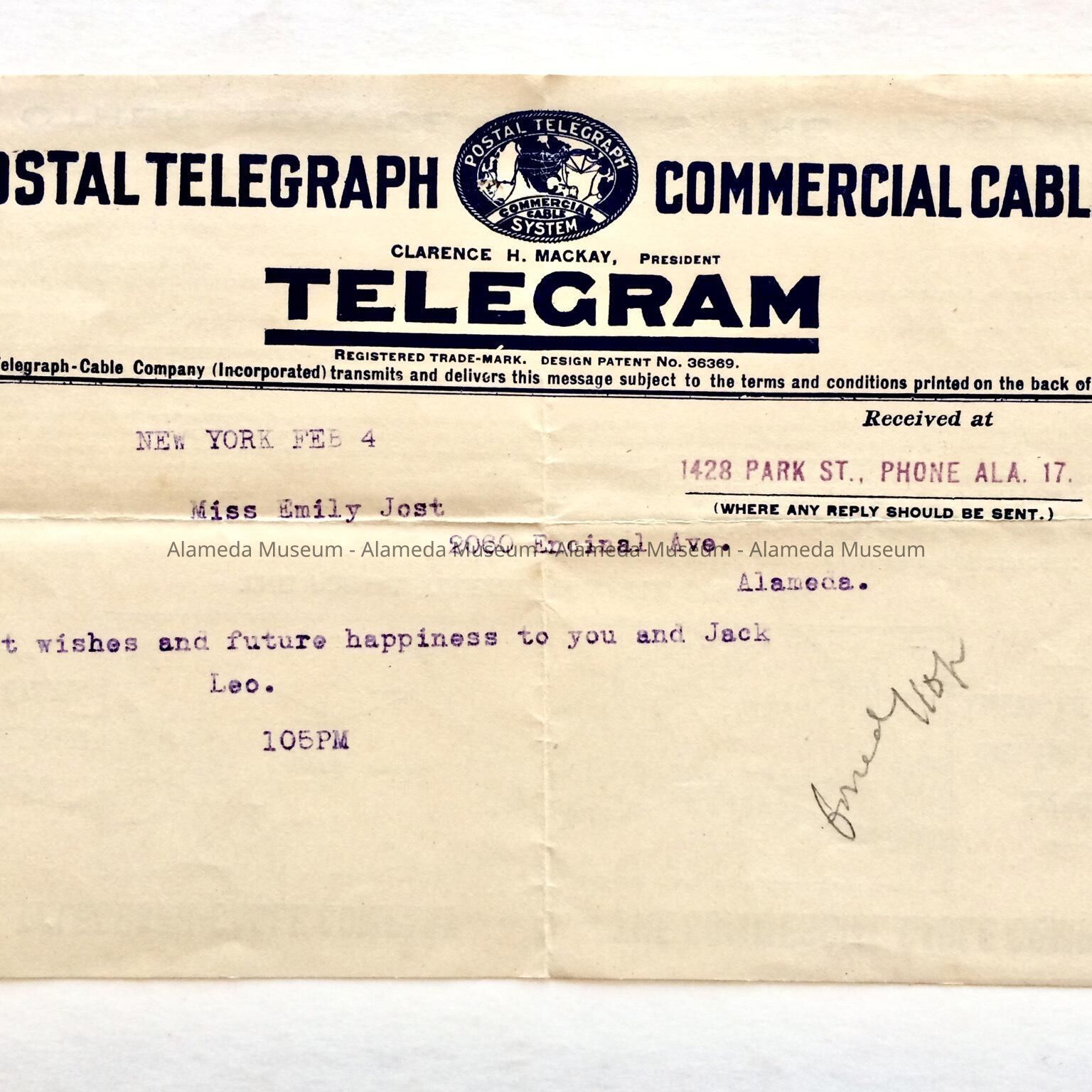 Telegram sent to Miss Emily Jost, 2060 Encinal Avenue, upon her marriage to J. F. Hanson, Feb. 4th, 1913. Miss. Jost was the mother of the donor.
