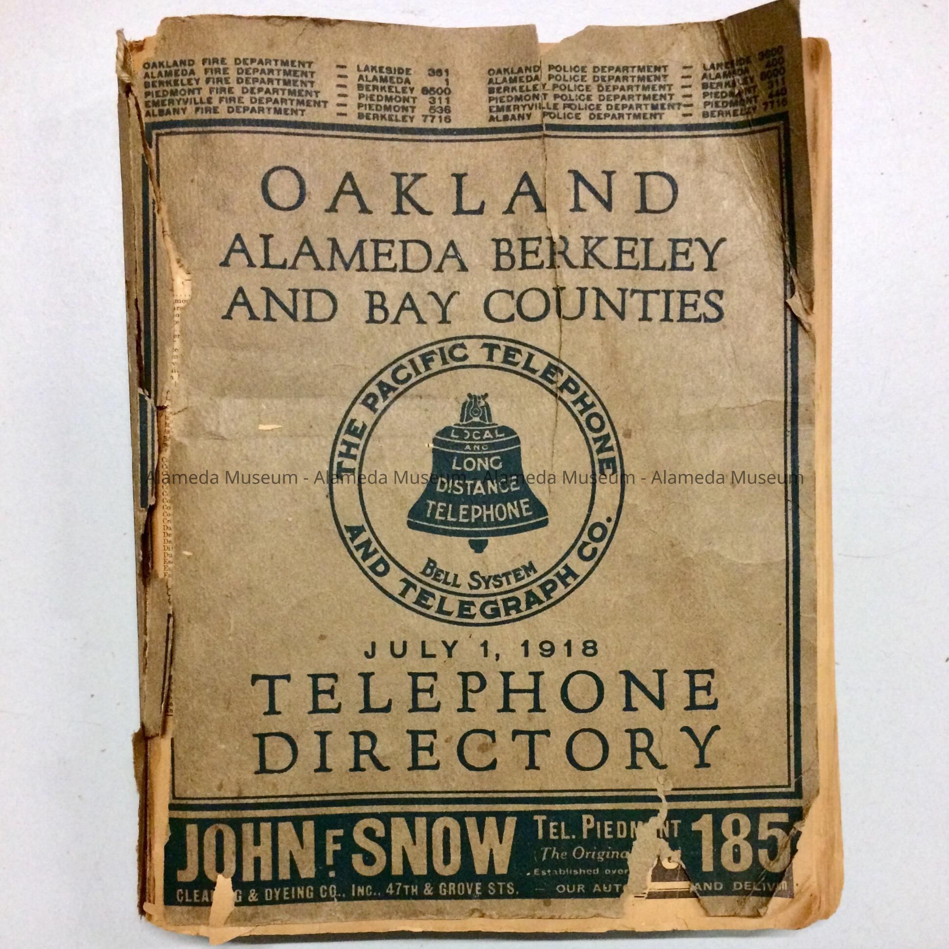DESCRIPTION: A SOFT COVER TELEPHONE DIRECTORY THAT HAS A BOLD PRINTED CAPTION ON ITS COVER, "OAKLAND, ALAMEDA, BERKELEY, AND BAY COUNTIES TELEPHONE DIRECTORY, JULY 1, 1918."