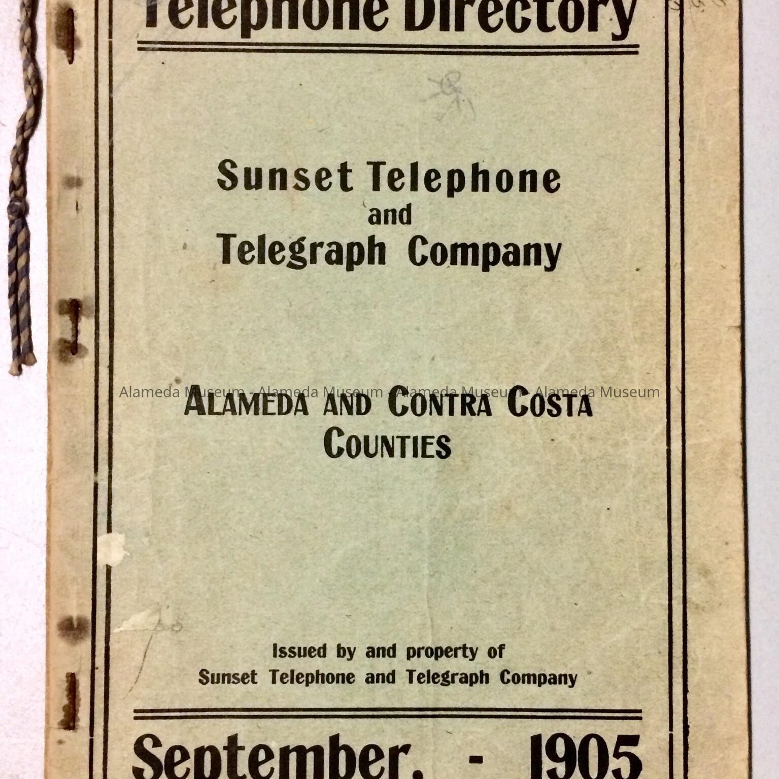 TELEPHONE DIRECTORY FOR ALAMEDA AND CONTRA COSTA COUNTIES, ISSUED BY THE SUNSET TELEPHONE AND TELEGRAPH COMPANY, SEPTEMBER 1905. THE DIRECTORY WAS GIVEN TO THE ALAMEDA HISTORICAL SOCIETY PRIOR TO 1971, NUMBERED "751," BUT HERETOFORE NOT OFFICIALLY CATALOGED.