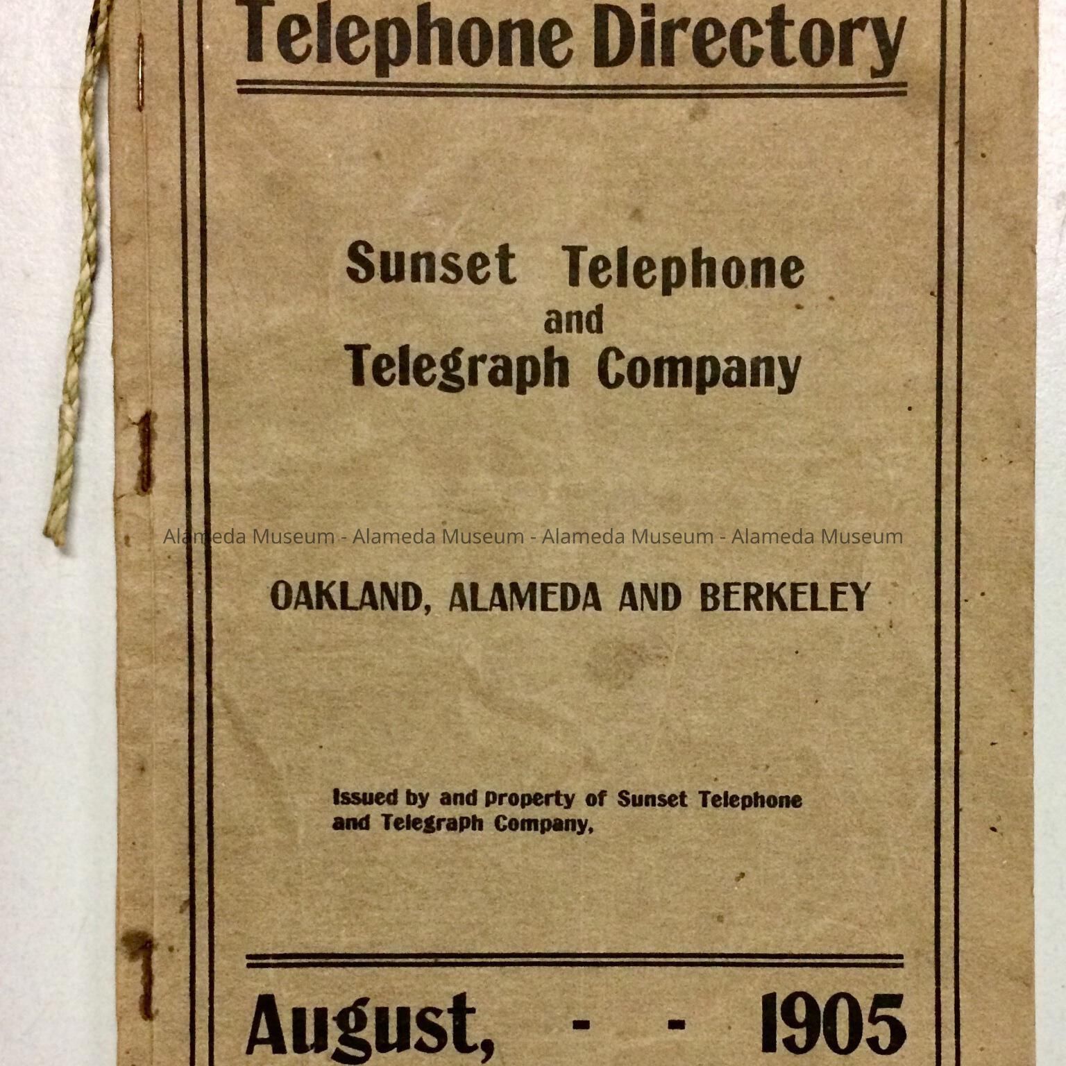 TELEPHONE DIRECTORY FOR OAKLAND, ALAMEDA, AND BERKELEY, ISSUED BY THE SUNSET TELEPHONE AND TELEGRAPH COMPANY, AUGUST 1905. THE DIRECTORY WAS GIVEN TO THE ALAMEDA HISTORICAL SOCIETY PRIOR TO 1971, NUMBERED "750," BUT HERETOFORE NOT OFFICIALLY CATALOGED.