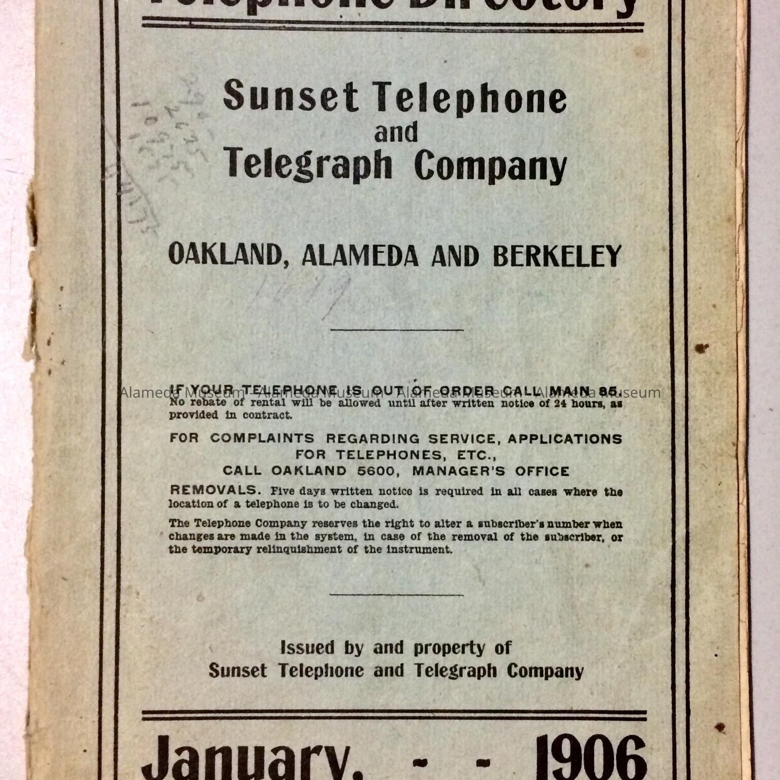TELEPHONE DIRECTORY FOR OAKLAND, ALAMEDA, AND BERKELEY. ISSUED BY THE SUNSET TELEPHONE AND TELEGRAPH COMPANY, JANUARY 1906. THE DIRECTORY WAS GIVEN TO THE ALAMEDA HISTORICAL SOCIETY PRIOR TO 1971, NUMBERED "752," AND HERETOFORE NOT OFFICIALLY CATALOGED.
