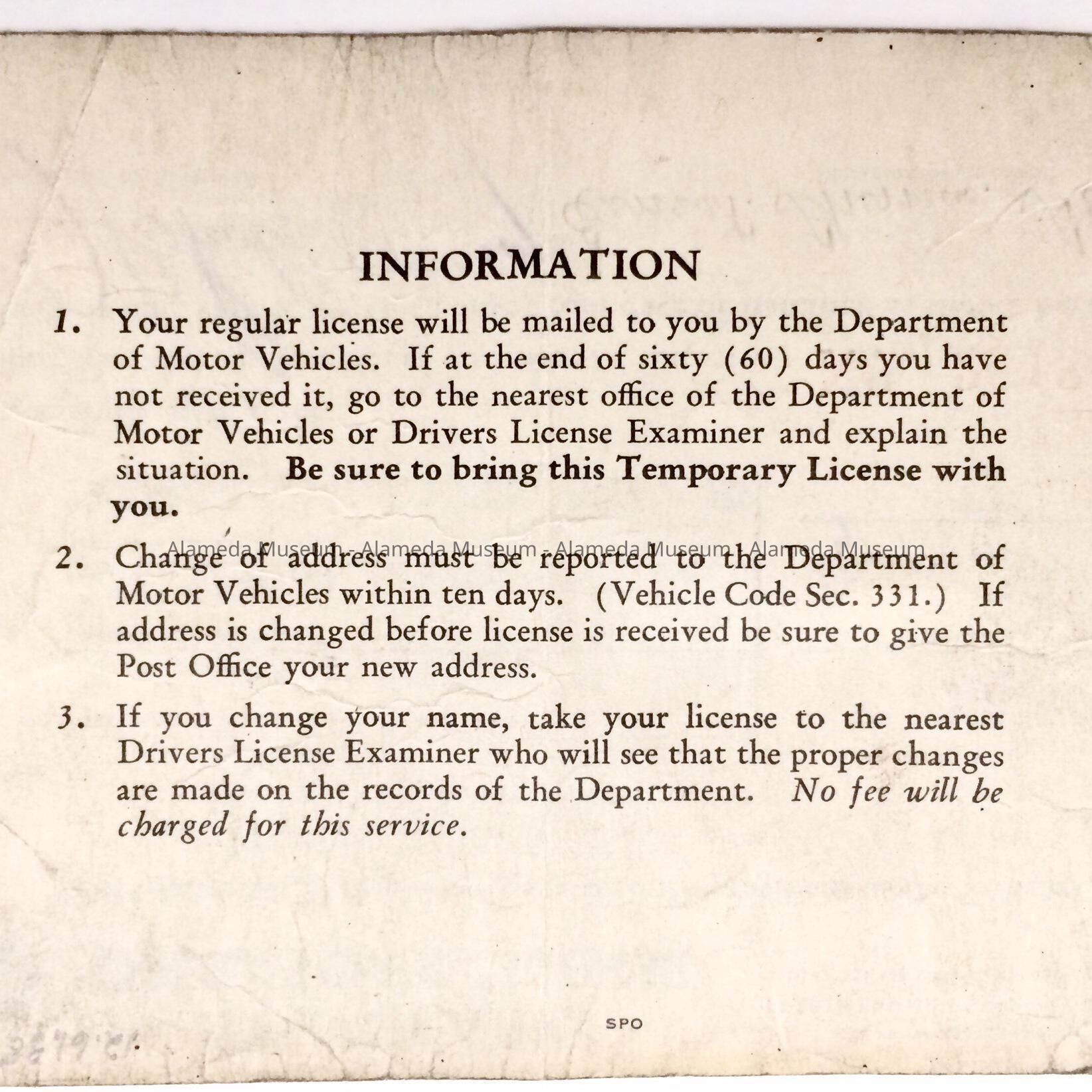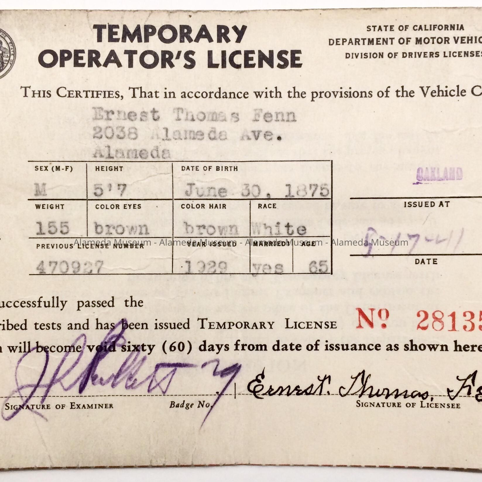 HISTORY OF OBJECT: A TEMPORARY OPERATOR'S LICENSE ISSUED BY THE STATE OF CALIFORNIA, DATED MAY 17, 1941 AND ADDRESSED TO ERNEST T. FENN OF 2038 ALAMEDA AVENUE, ALAMEDA.