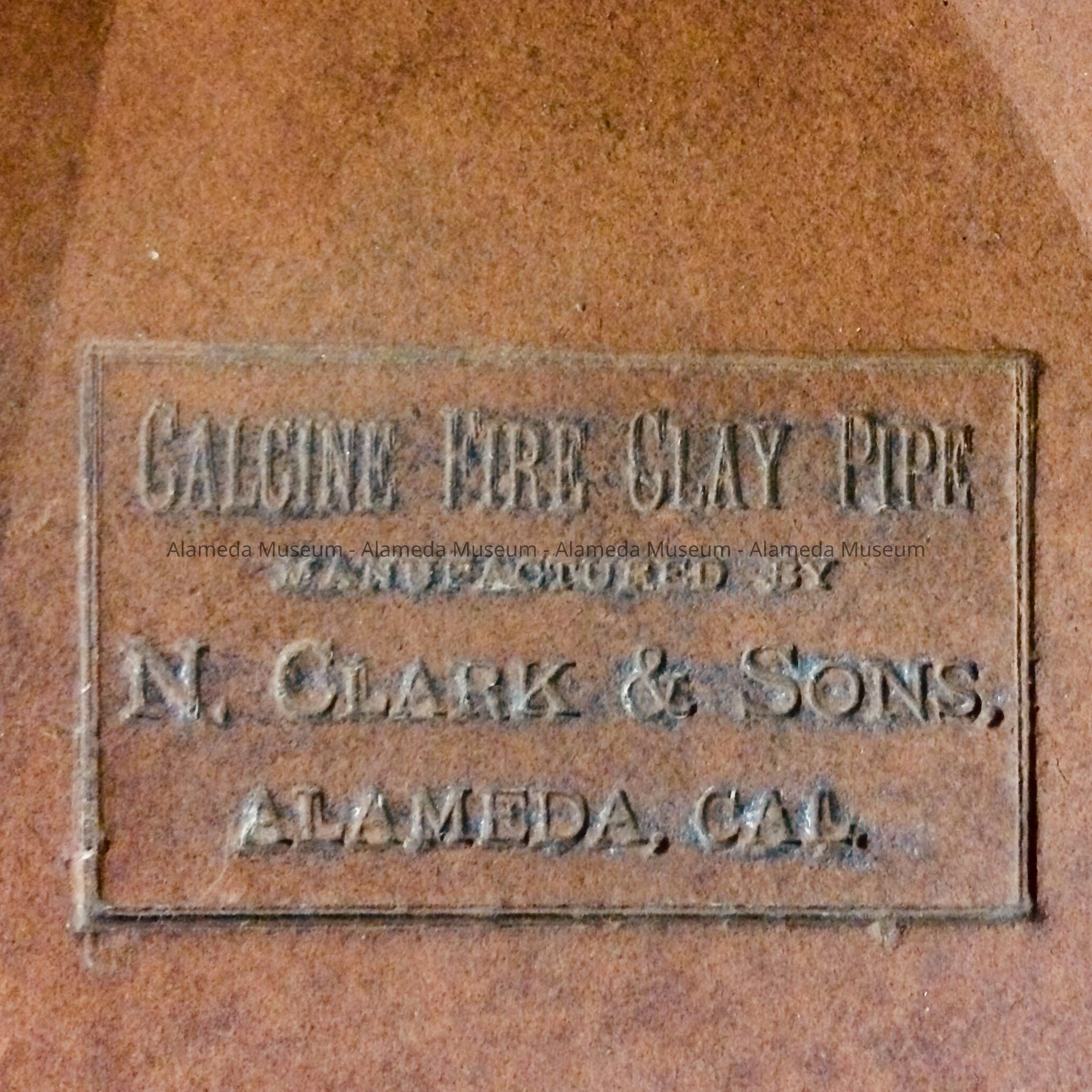 Description: Terra-cotta chimney top, round with eight openings (vents), topped by slanted octagon cover terminating in a finial. Impressed in the terra-cotta on one of the sloping panels on the roof of the chimney top it states "Calcine Fire Clay Pipe, manufactured by N. Clark & Sons, Alameda, Cal".
