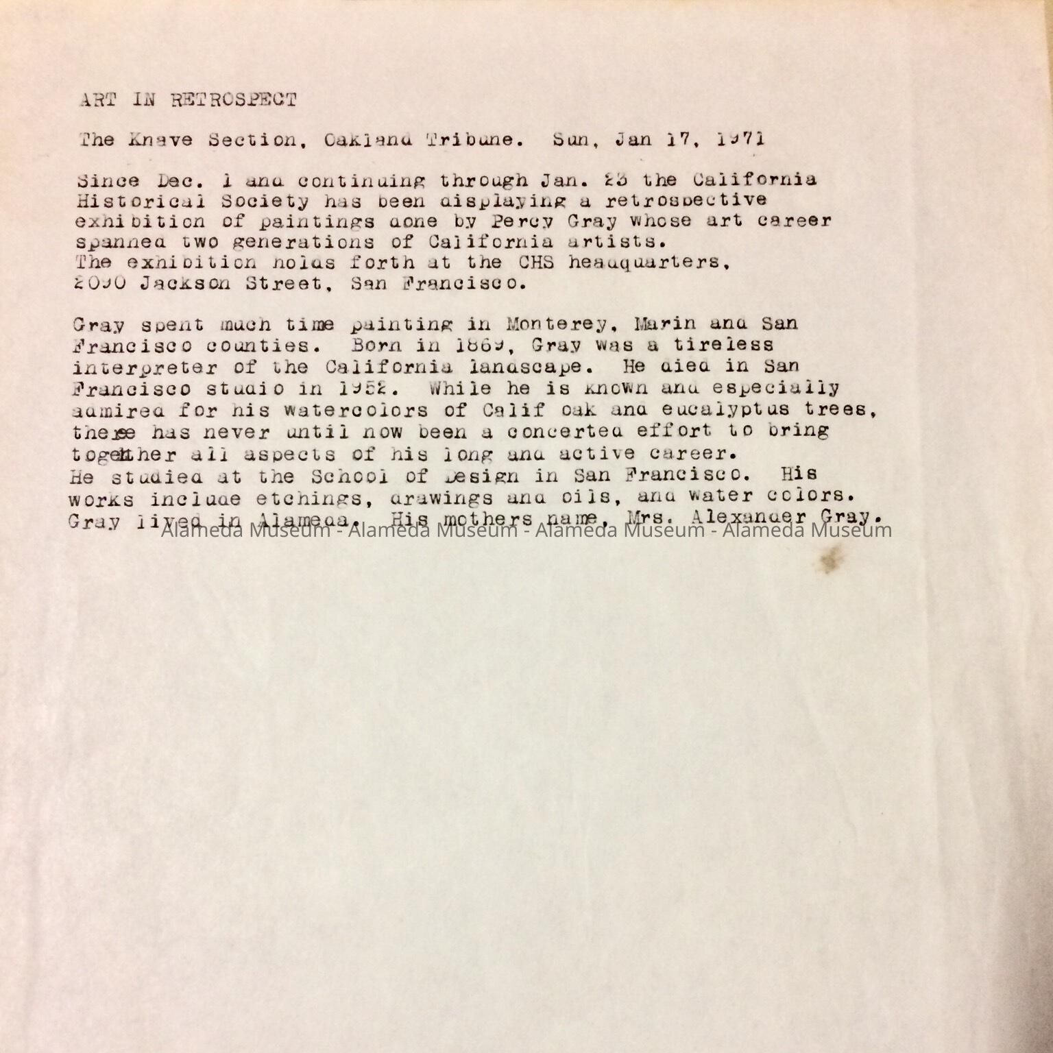 HISTORY OF OBJECT: A CLIPPING CONCERNING AN EXHIBIT, "ART IN RETROSPECT." EXHIBIT OF PERCY GRAY NOTED CALIFORNIA WATERCOLORIST. MR. GRAY AND HIS FAMILY ONCE RESIDED AT 1417 ST. CHARLES STREET, ALAMEDA.