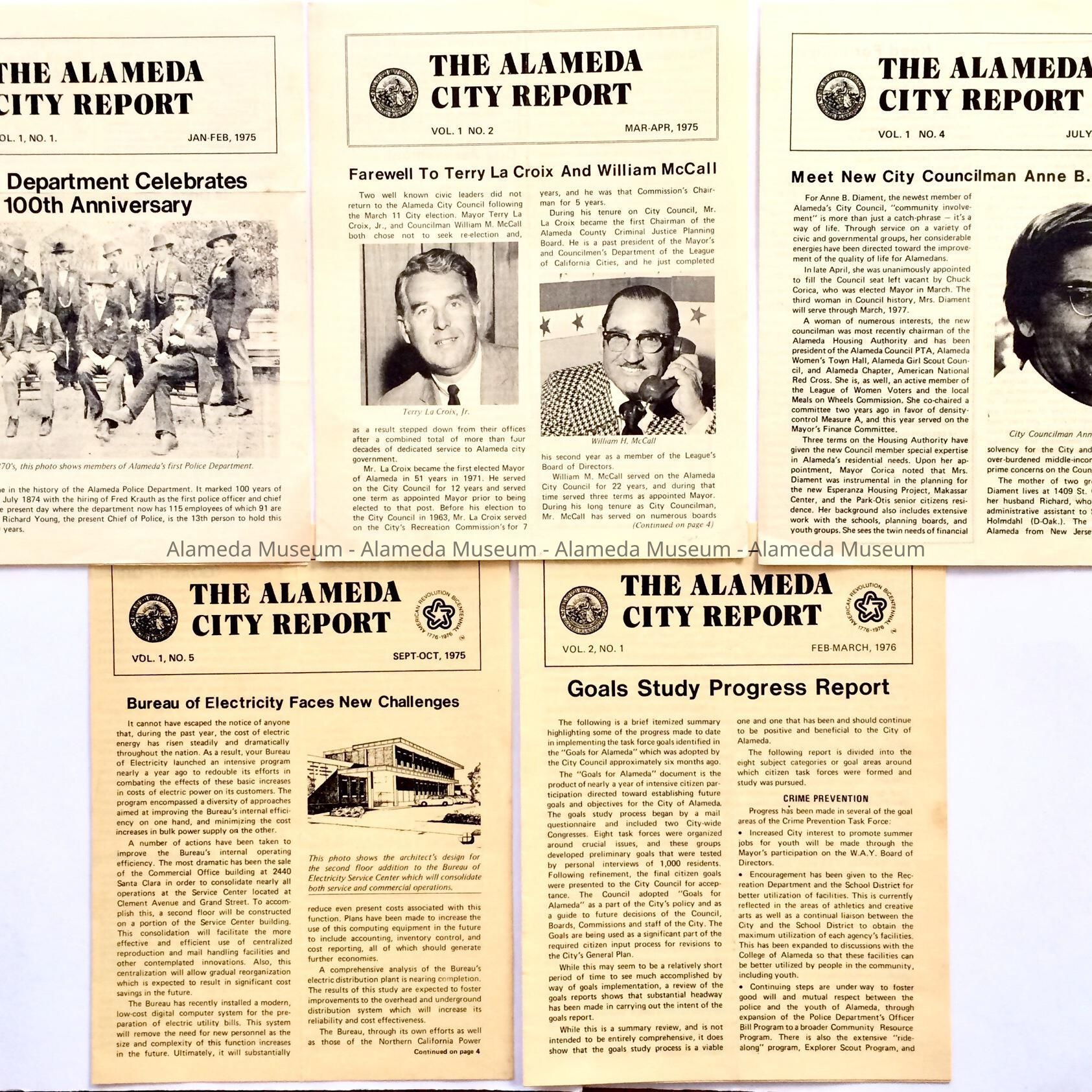 PUBLICATIONS ISSUED BY THE CITY OF ALAMEDA ON VARIOUS SUBJECTS, INCLUDING THE POLICE DEPARTMENT'S 100th ANNIVERSARY, FAREWELL TO TERRY LA CROIX (MAYOR), INTRODUCTION TO THE NEW CITY COUNCIL, ANNE DIAMENT, ETC.