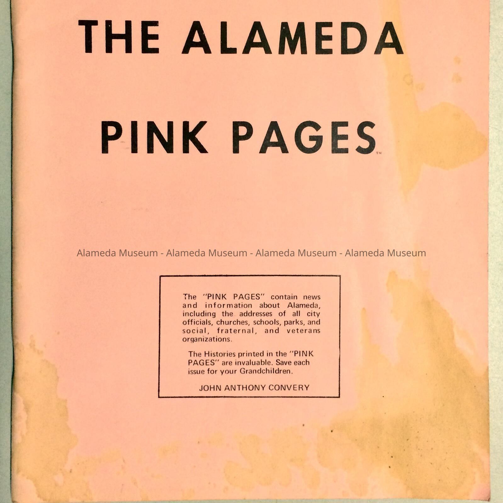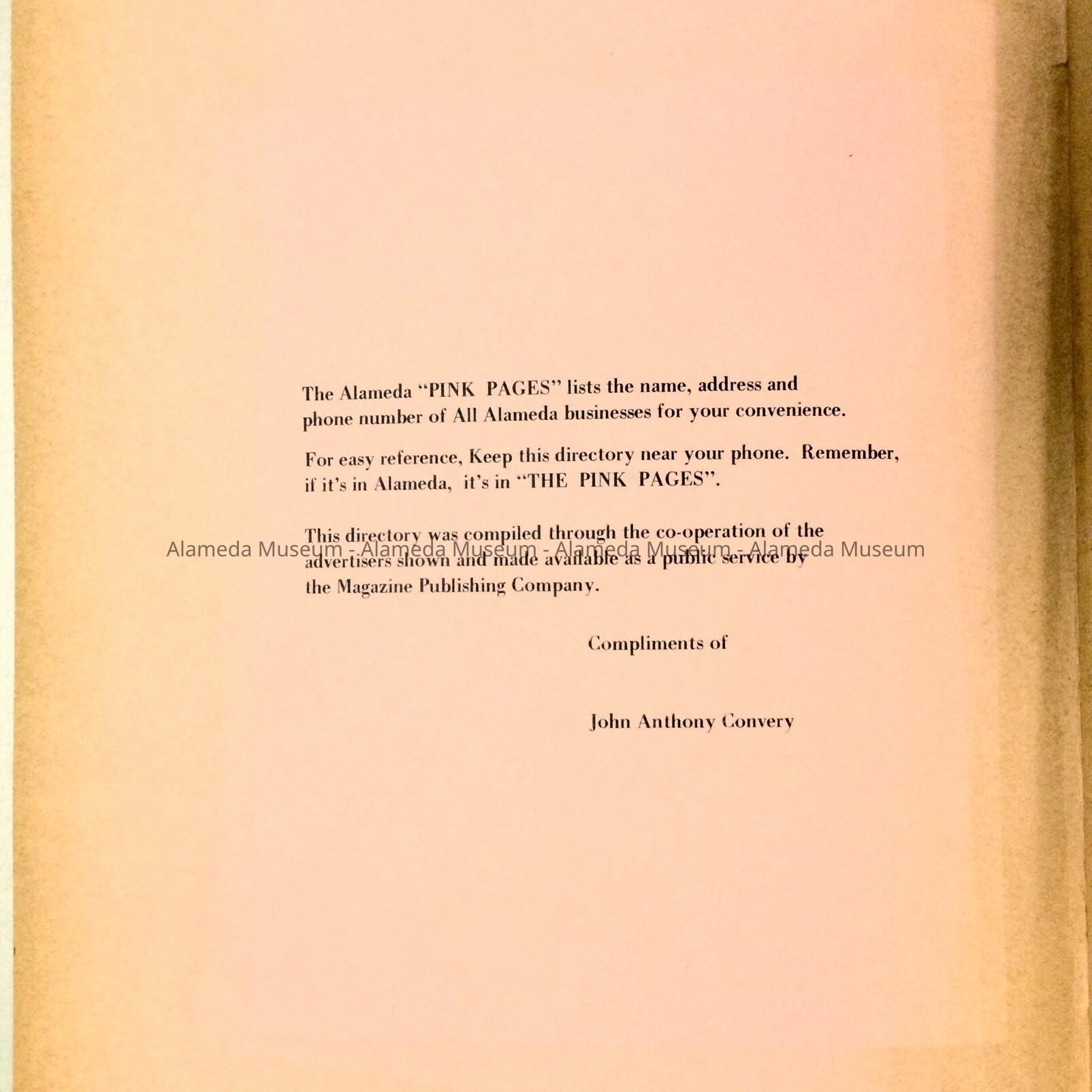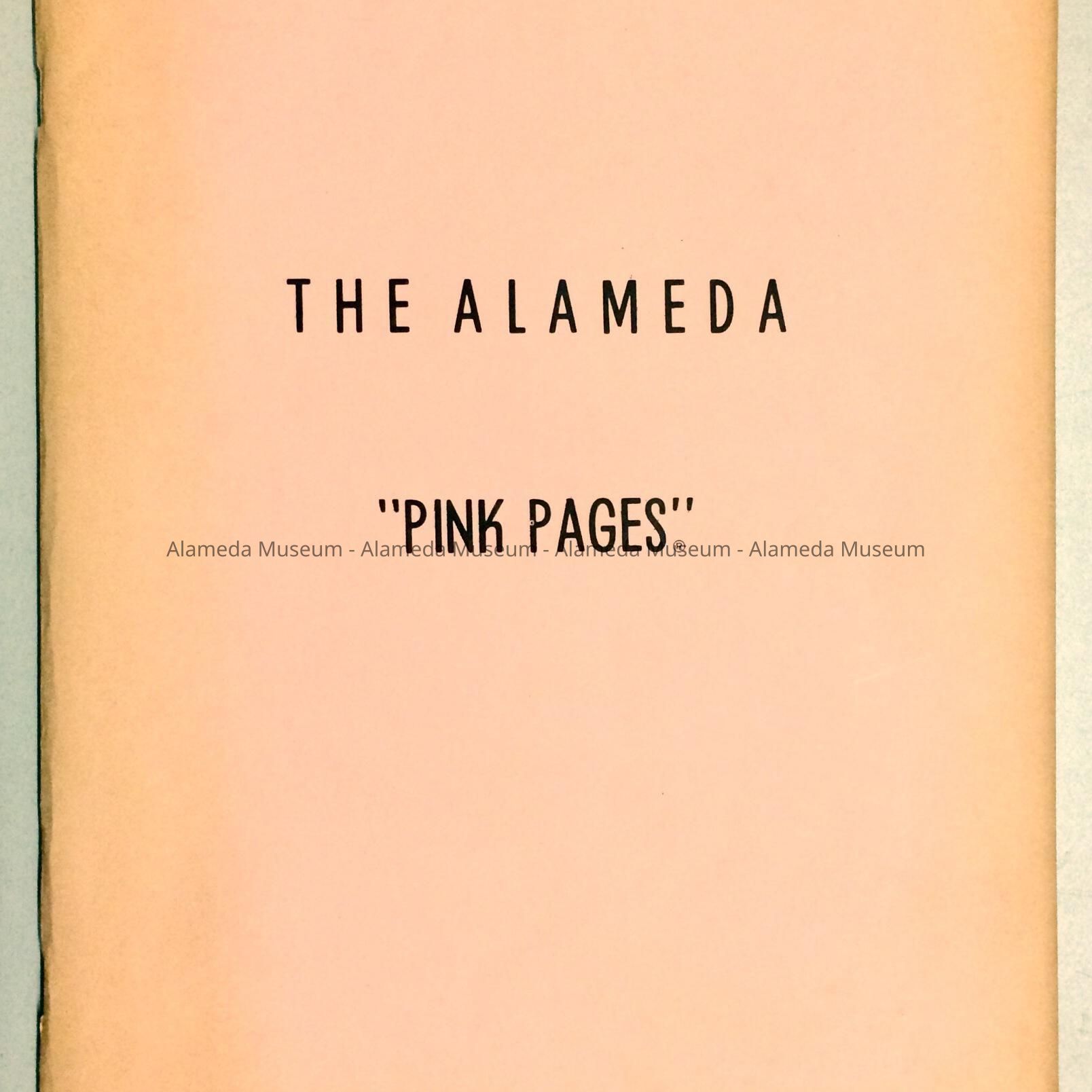 A BUSINESS DIRECTORY FOR ALAMEDA, KNOWN AS THE "PINK PAGES." LISTS LOCAL BUSINESSES OF THE PERIOD, PLUS A SECTION ON ALAMEDA HISTORY, WRITTEN BY IMELDA MERLIN.