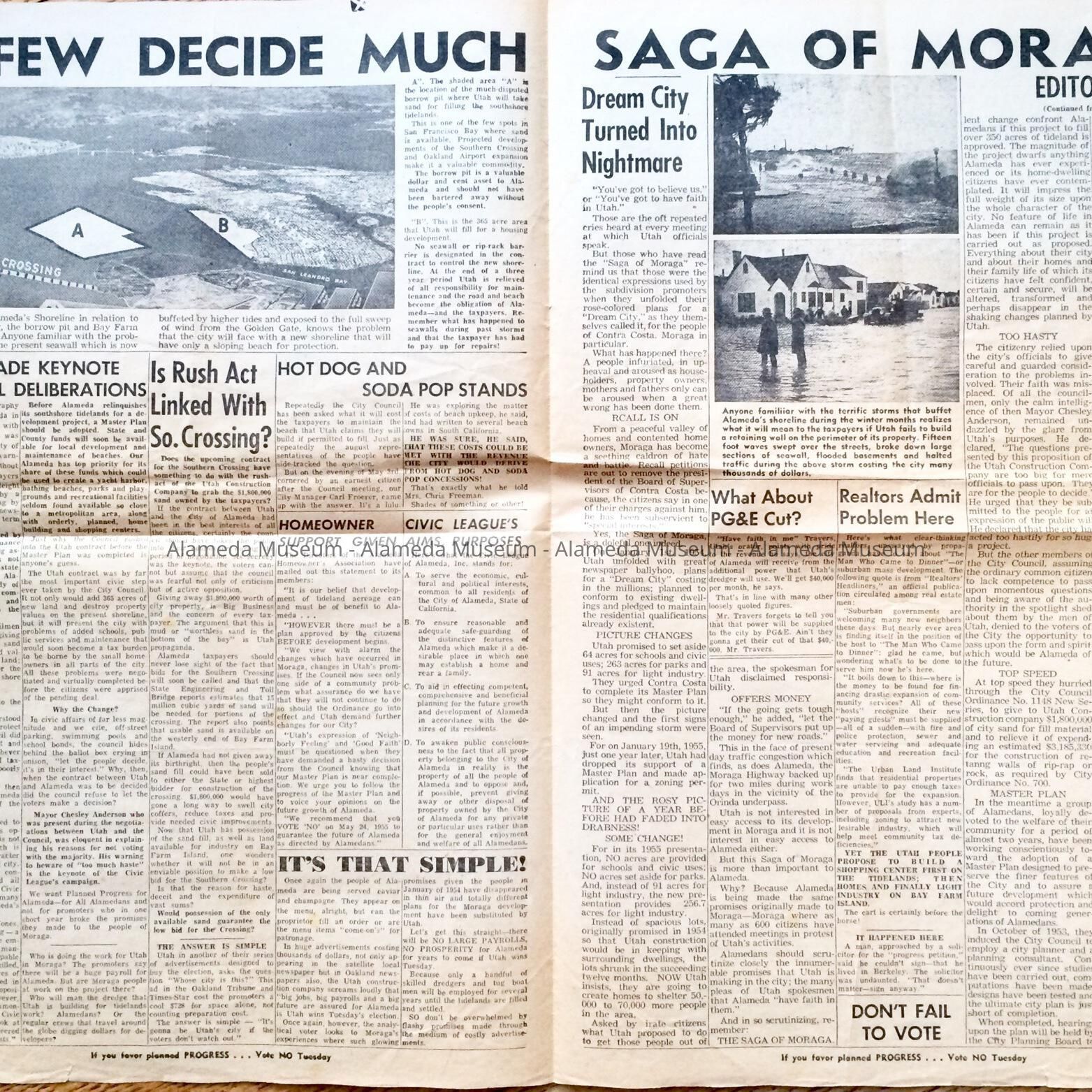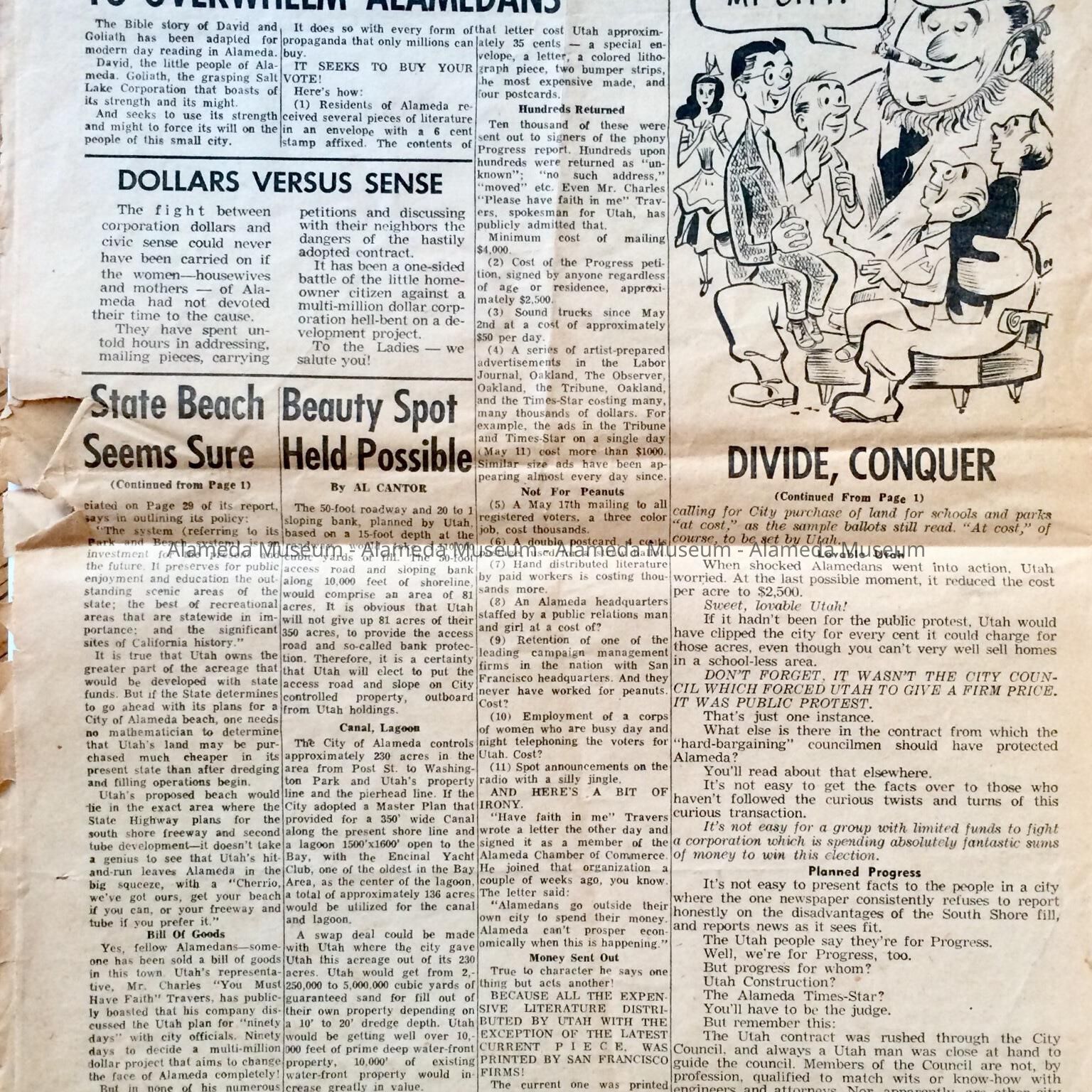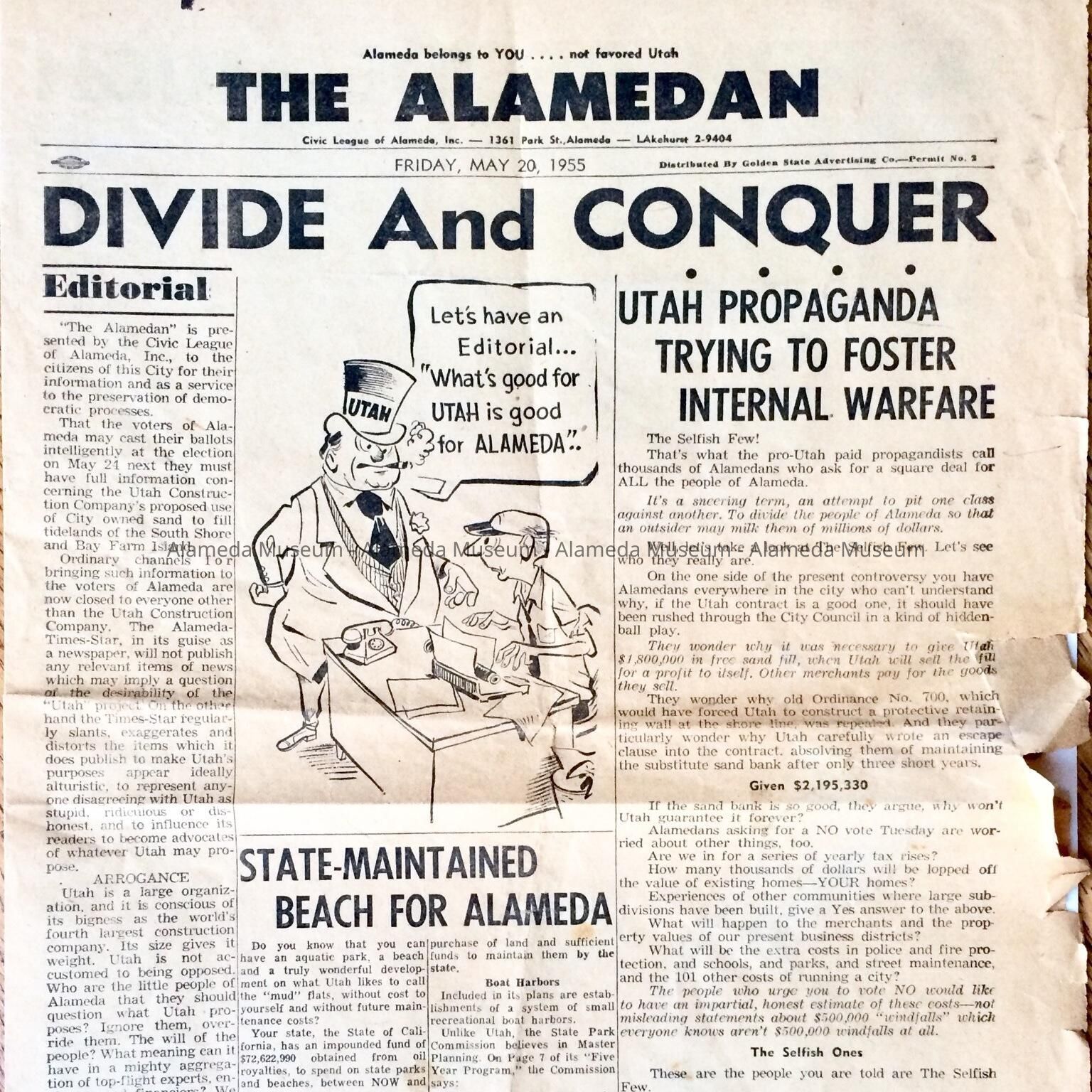 A PUBLICATION ENTITLED, "THE ALAMEDAN," PRODUCED BY THE CIVIC LEAGUE OF ALAMEDA, INC., 1361 PARK STREET, ALAMEDA. THE NEWSPAPER CONCERNS THE POLITICAL STRIFE CREATED BETWEEN SOME OF THE CITIZENS OF ALAMEDA AND THE UTAH CONSTRUCTION COMPANY.
